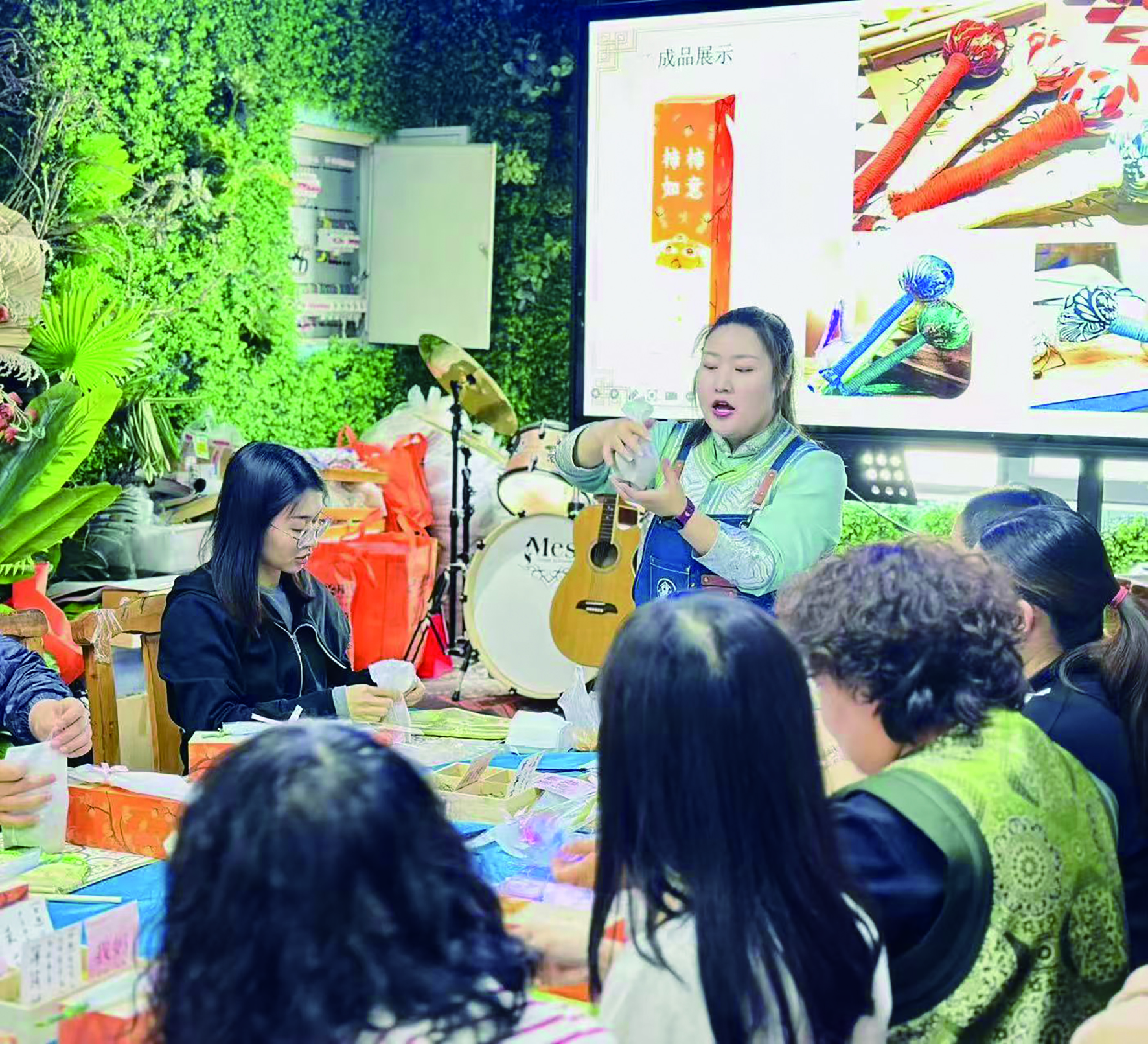 “从宋代初具雏形,到清代《红楼梦》中提及的‘美人捶’,再到近代融合多种技艺的创新,养生锤承载着丰富的文化内涵……”活动伊始,讲师王晶为市民们详细讲解艾草养生锤的发展历程。理论知识讲解后,20名体验者进入实操体验环节,在讲师的指导下亲手制作古法养生锤。体验者们按照步骤,将草药放入无纺布袋,精心包裹、缠绕。体验者们相互协作,年轻女孩儿手指灵活地帮忙绑流苏,年长的女士开心地分享养生心得,温馨画面不断涌现。