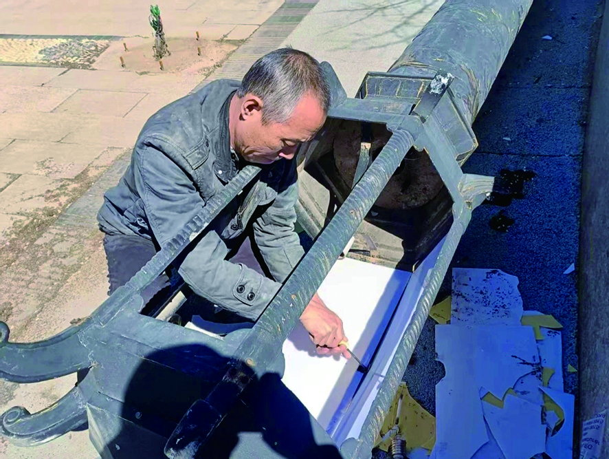 ●工人更换新灯罩 本报记者 李梦娜 摄
