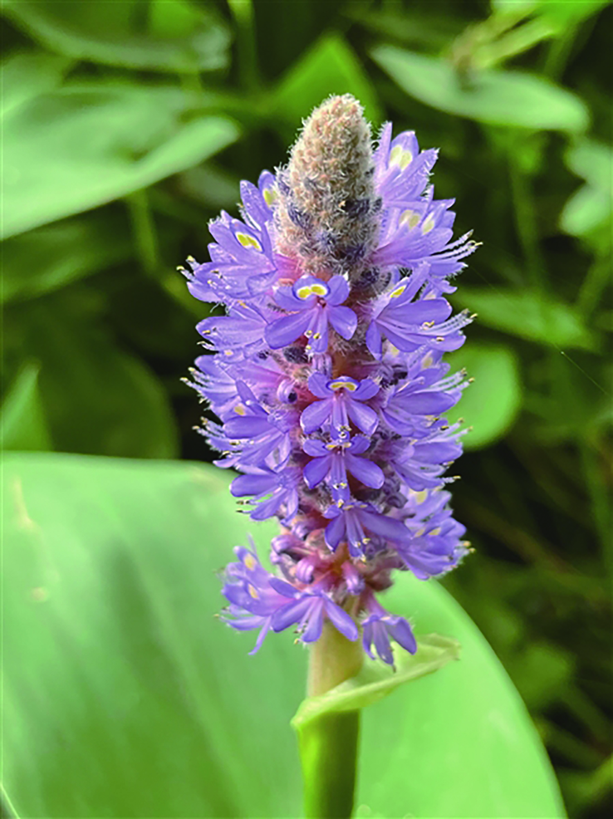 盛夏时节,漫步池塘边,蓝紫的梭鱼草花仿佛具有一种魔力,格外引人注目。与荷花、睡莲艳丽的大花朵相比,梭鱼草的花朵小而密集。远看,它们就像一把把蓝紫色的瓶刷,挺立于心形的大叶子间,散发着独特的韵味,让人忍不住想走近细看。
