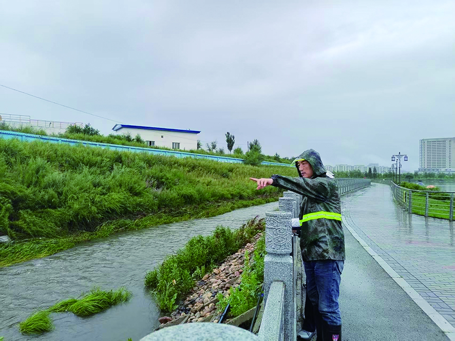 ●工作人员巡查河道水位 本报记者 李梦娜 摄