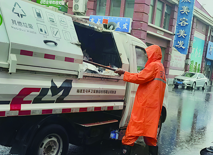 集宁区新体大街上,收运车的提示音乐伴着雨丝飘来,商户拎着泡透的垃圾袋走向收集车,司机查看后朝商户喊着“还能装”,见有商户倾倒不便,立刻主动下车帮忙,湿垃圾沉重发滞,铁锹插进去得用肩头顶才动,压实时污水溅到裤腿也不顾。另一边,工人们挥锹将边角垃圾拢向中间,再使劲摁实腾空间,方便后续收运。雨从帽檐滴落,打在铁锹柄上“嗒嗒”响,他们重复着挥锹、下压、拢堆的动作,随着收运车缓缓前移,持续完成垃圾收运任务。