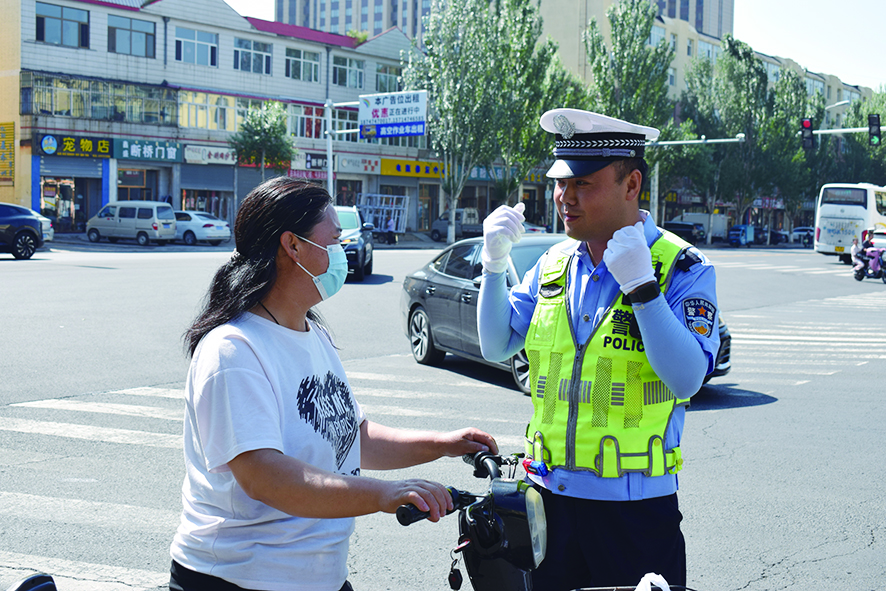 在集宁区的怀远北路与通州路交会路口,乌兰察布市公安局集宁分局交通管理大队三中队辅警田志勇和同事们正在街头执勤。街道上,行人和电动车驾驶员们“全副武装”避暑,站在烈日下的“荧光绿”显得格外耀眼。“大姐,您的头盔呢?”“机动车不能走非机动车道,违反交规了。”田志勇的声音在热浪中格外清晰。
