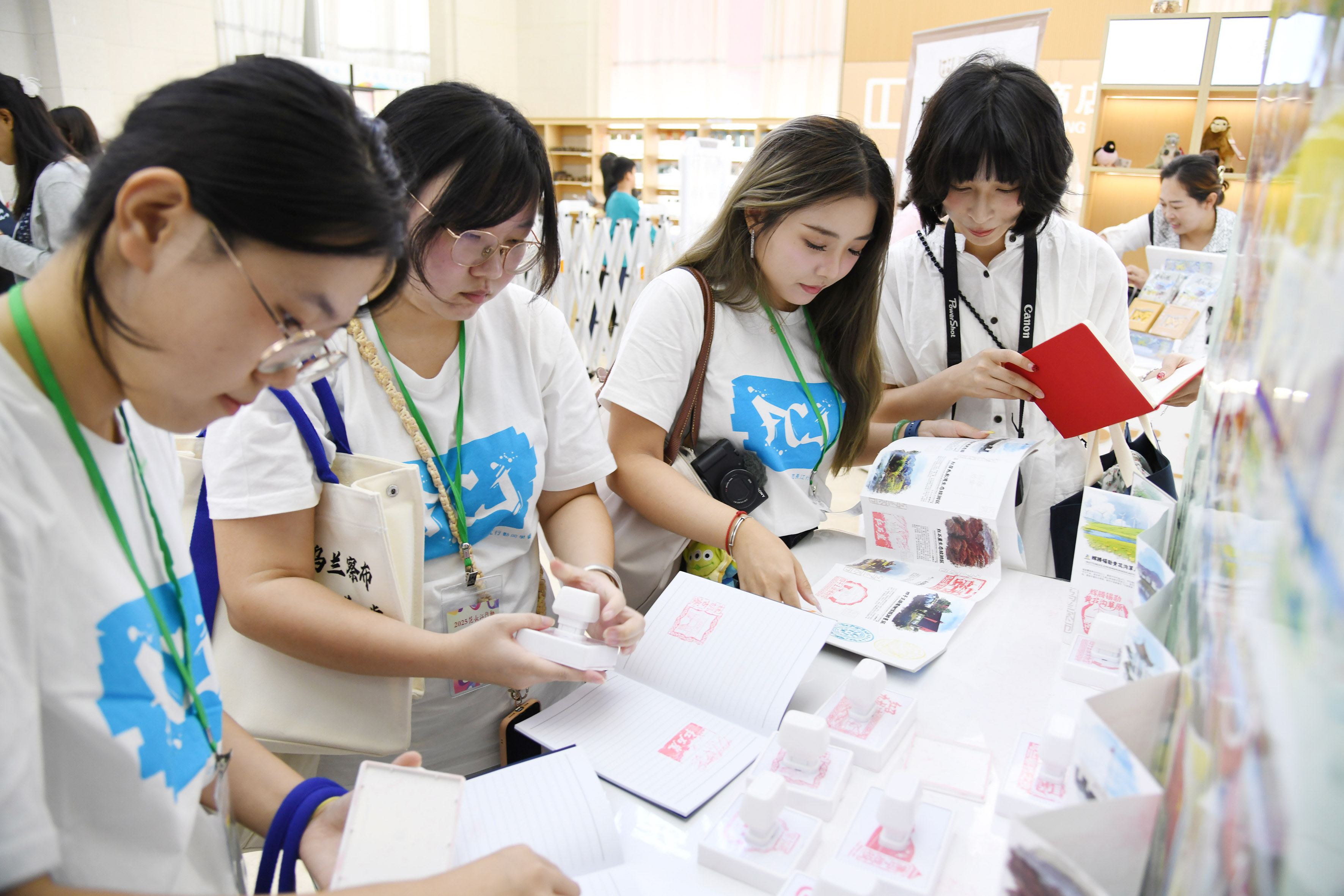 在文创区,传媒学子为挑选好的纪念品盖章。本报记者 郭小燕 摄
