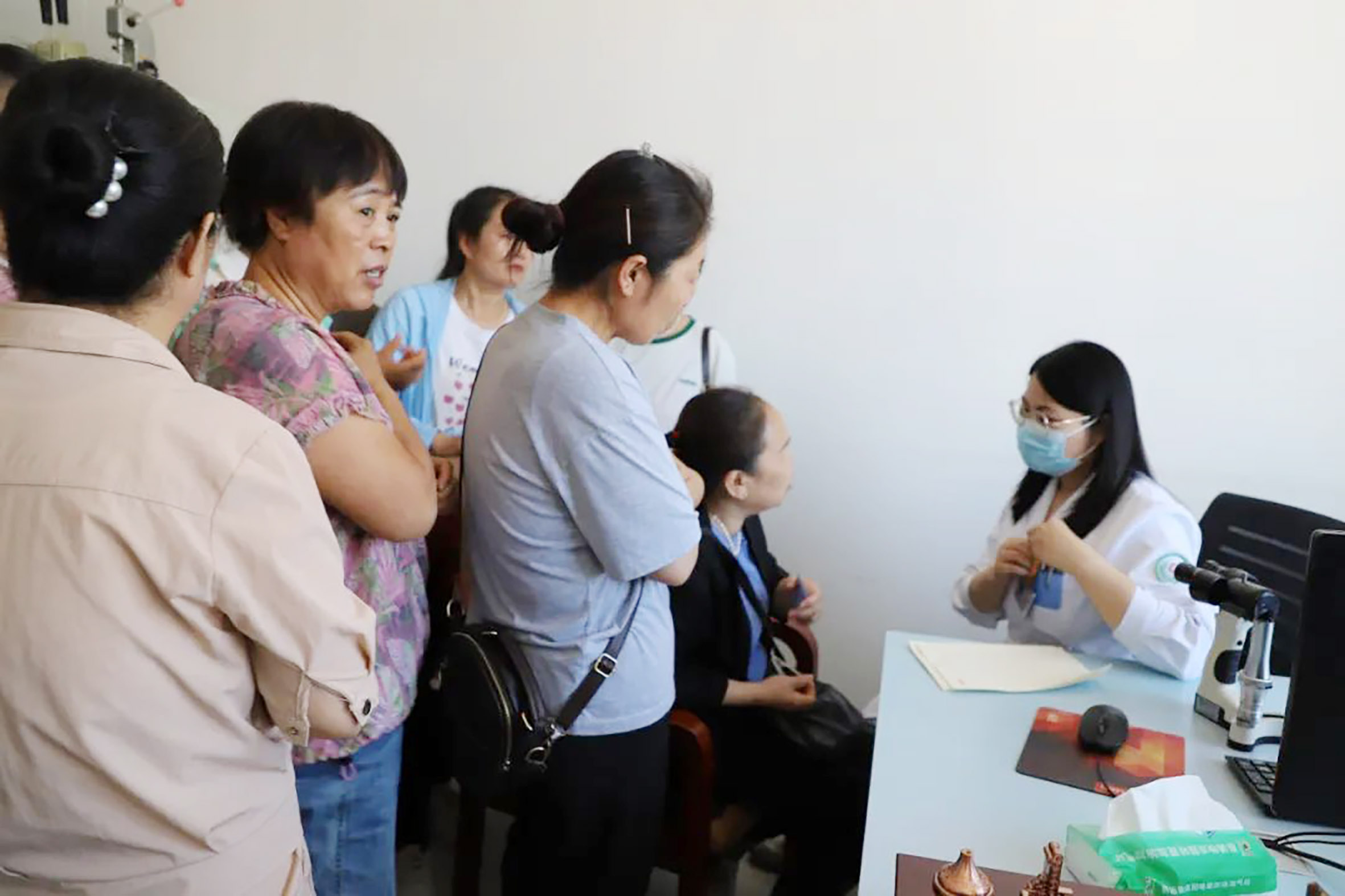 北京普仁医院对口帮扶眼科专家袁梦娇正在为企业女职工讲解眼科常见疾病的防治方法。