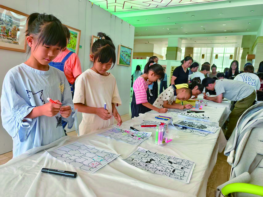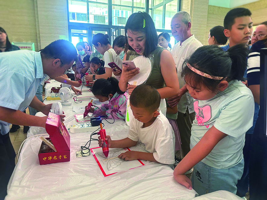 除了作品展示,孩子们还沉浸式体验了剪纸、拓印、漆扇、糖画等非遗项目。剪纸台前,红色彩纸在非遗传承人手中翻飞,转眼间化作展翅的蝴蝶、憨态可掬的福娃,引得孩子们阵阵惊呼。拓印区里,墨香与纸香交织,10岁的琪琪在工作人员指导下完成人生第一幅拓印作品,举着花鸟图案兴奋道:“我成功啦!”家长汪帅感慨:“孩子玩得开心,更重要的是通过动手参与提升了综合素质,这种活动很有意义。”