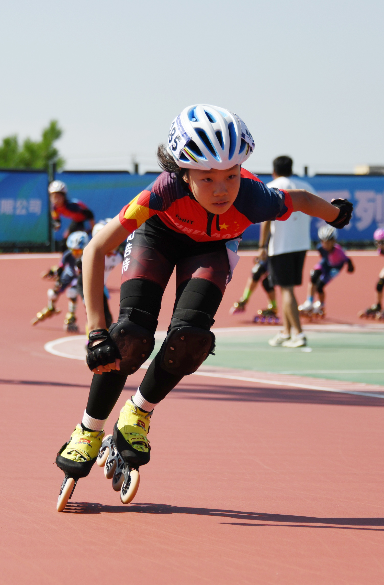 轮滑赛场上小选手弯腰加速。实习记者 梁子萌 摄