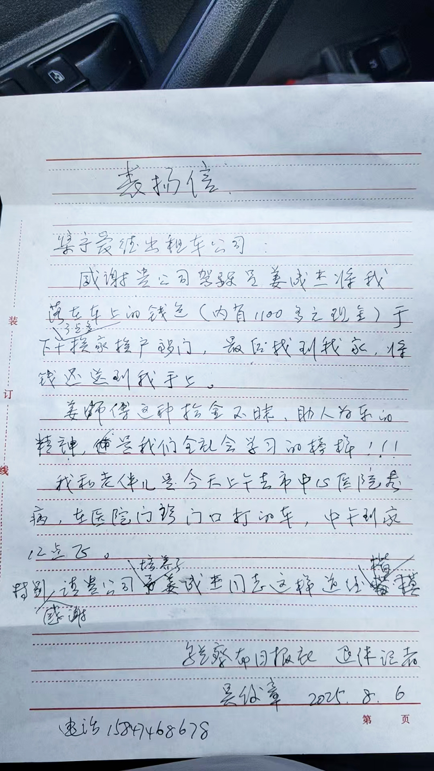 “姜成杰离开后,我的心情久久不能平复。为了表达我的感激之情,也为了传递正能量,我便给他所在的爱德出租车公司写了封简短的感谢信,告诉他们姜师傅这个人真不错!拾金不昧可是我们老祖宗留下来的好品德,他这么做可是让了我避免了经济损失,真是太感谢他了。”吴女士说。