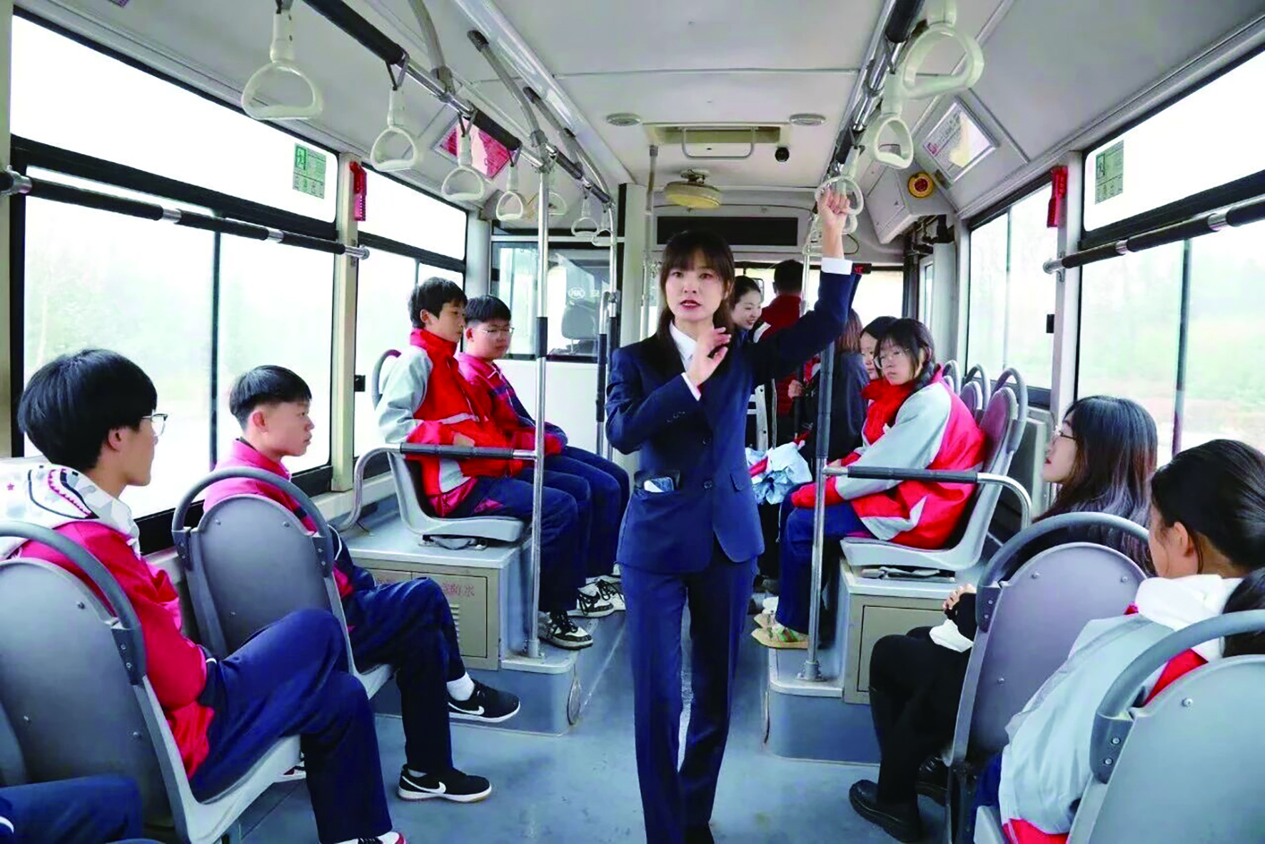 ●工作人员在公交车上为孩子们普法本报记者 朱旭敏 摄
