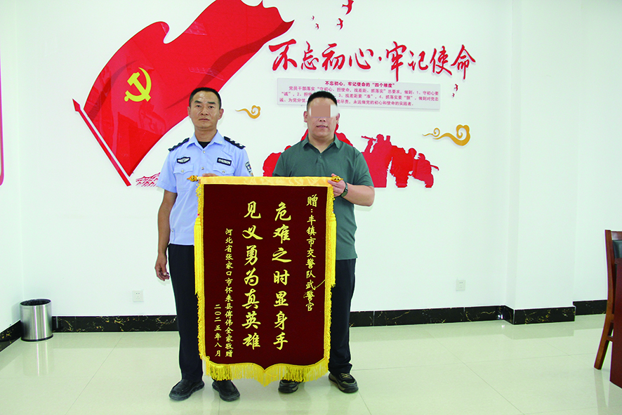 “正是有了像武永红这样为人民无私奉献的警务人员守护,才有了万千家庭的幸福美满与平安祥和!” 近日,一封来自河北省张家口市的感谢信悄然送达丰镇市公安局政工室。信中,傅先生字里行间满是对乌兰察布市公安局交管支队丰镇大队辅警武永红的感激之情。不久后,傅先生专程来到丰镇市,将一面印着“危难之时显身手、见义勇为真英雄”的锦旗亲手交到武永红手中,再次当面表达全家人的谢意。