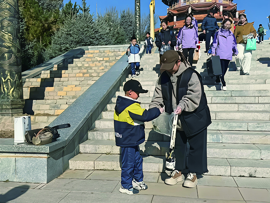 登临凤凰塔顶,集宁城的秀美风光尽收眼底。教师就地开设“自然讲堂”,向孩子们细致讲解凤凰塔的建筑特色,以及它在集宁城市发展中的文化印记。同时引导孩子们在沉浸式观察中认读相关文字,将“绿水青山就是金山银山”的发展理念,悄悄种进孩子们的心里。下山途中,环保实践成为活动的又一亮点。在教师的倡议下,孩子们瞬间化身为“环保小卫士”,沿着山路认真拾捡垃圾,用小小的身影践行志愿服务精神,为守护家乡的青山绿水贡献着童真力量。