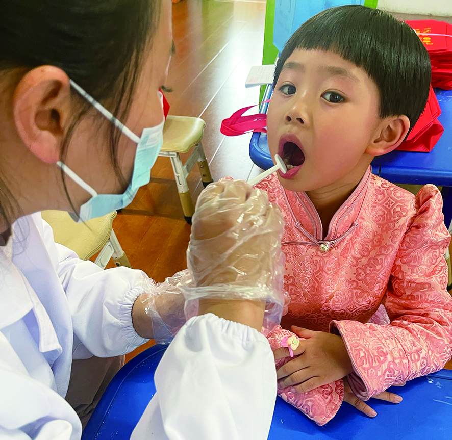●医务人员为小朋友检查牙齿 本报记者 鲍娜 摄