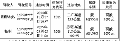 公告期内当事人享有陈述、申辩的权利,对拟作出2000元以上罚款处罚的,有权提出听证申请。当事人需要提出陈述、申辩意见或者听证申请的,应当自本公告发布之日起七日内向高速公路二支队赛汗塔拉大队提出,逾期未提出的,视为放弃相关权利,公安机关交通管理部门将依法作出行政处罚决定。公告期满,公安交通管理行政处罚前告知视为送达。(联系人:刘警官、青警官,联系电话:18147417919)。特此公告