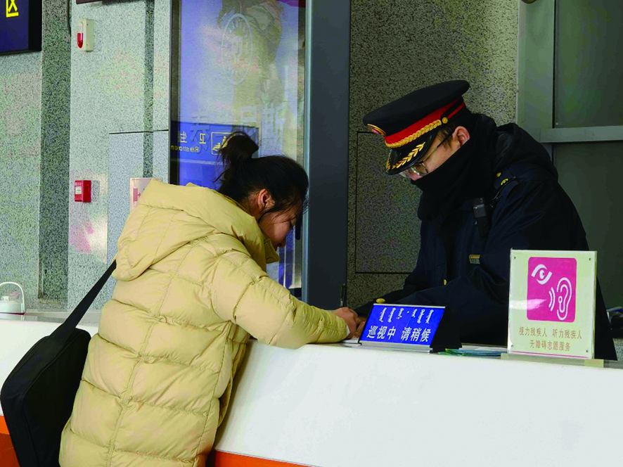 车站工作人员为旅客服务 本报记者 鲍娜 摄