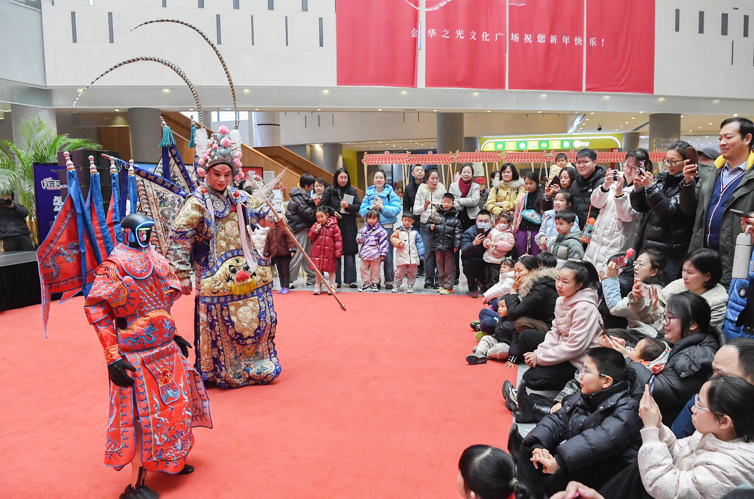 2月7日,在浙江省金华科技馆,婺剧演员与机器人一起表演婺剧。 春节将至,各地年味渐浓。人们购年货、逛集市、参加喜庆活动,欢喜迎新春。 新华社发(时宽兵 摄)