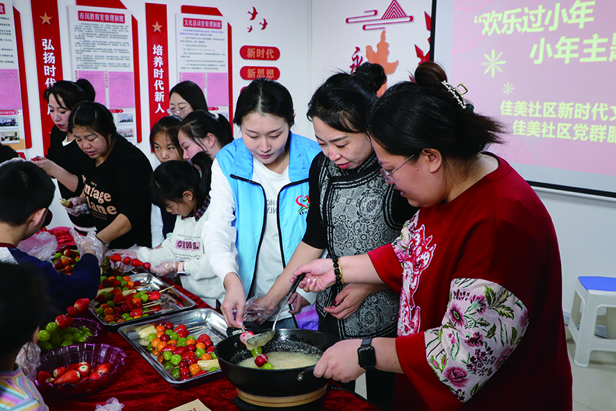 走进佳美社区活动室,老人们正在教孩子们剪纸。她们戴着老花镜,手里拿着剪刀,在红纸上灵活地剪动着。孩子们跟着老人的动作,小心翼翼地剪着。随着剪刀的“咔嚓”声,红纸变成了各种精美的图案,有寓意吉祥的锦鲤,有象征团圆的石榴。孩子们把剪好的作品贴在窗户上,原本单调的窗户变得喜庆起来。活动室的另一边,糖葫芦制作也在有序进行。孩子们在社区志愿者的帮助下,将山楂、草莓、葡萄等水果串成串。熟练地熬着糖浆,孩子们排着队,把自己串好的水果递给工作人员裹糖。不一会儿,一串串晶莹剔透的糖葫芦就做好了。