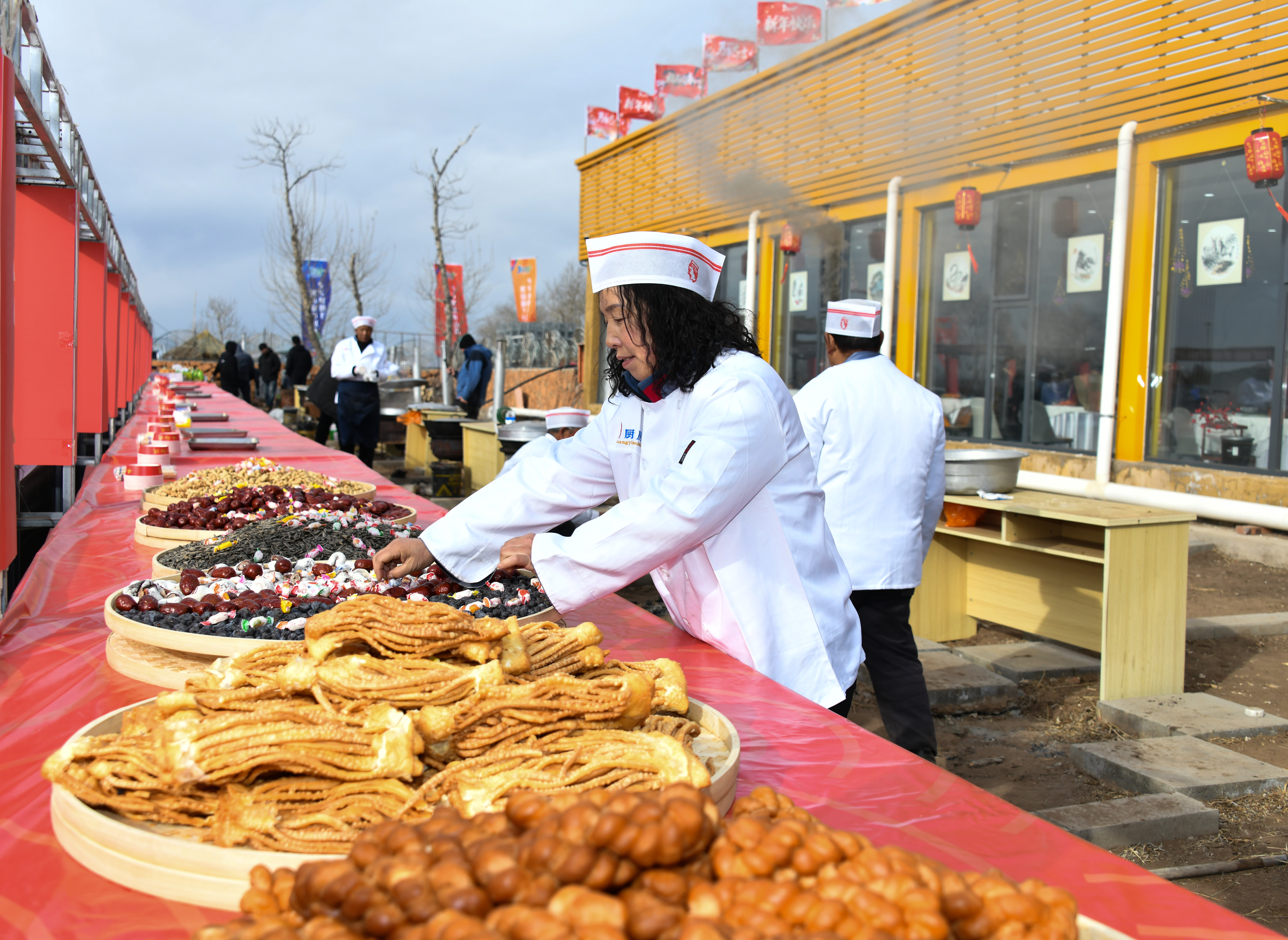 在非遗年货一条街,剪纸、春联、宋锦织造、察哈尔毛绣、火山石文创等手工艺品琳琅满目,红土豆、燕麦、玉米、手工醋等农副产品香气扑鼻,摊主们热情地向游客介绍产品特色,游客们纷纷选购心仪产品,呈现购销两旺的景象。民俗互动体验区更是热闹非凡,写福字、春联的游客络绎不绝,包饺子、烤土豆、制作杀猪菜的体验区前排起长队,欢声笑语此起彼伏。