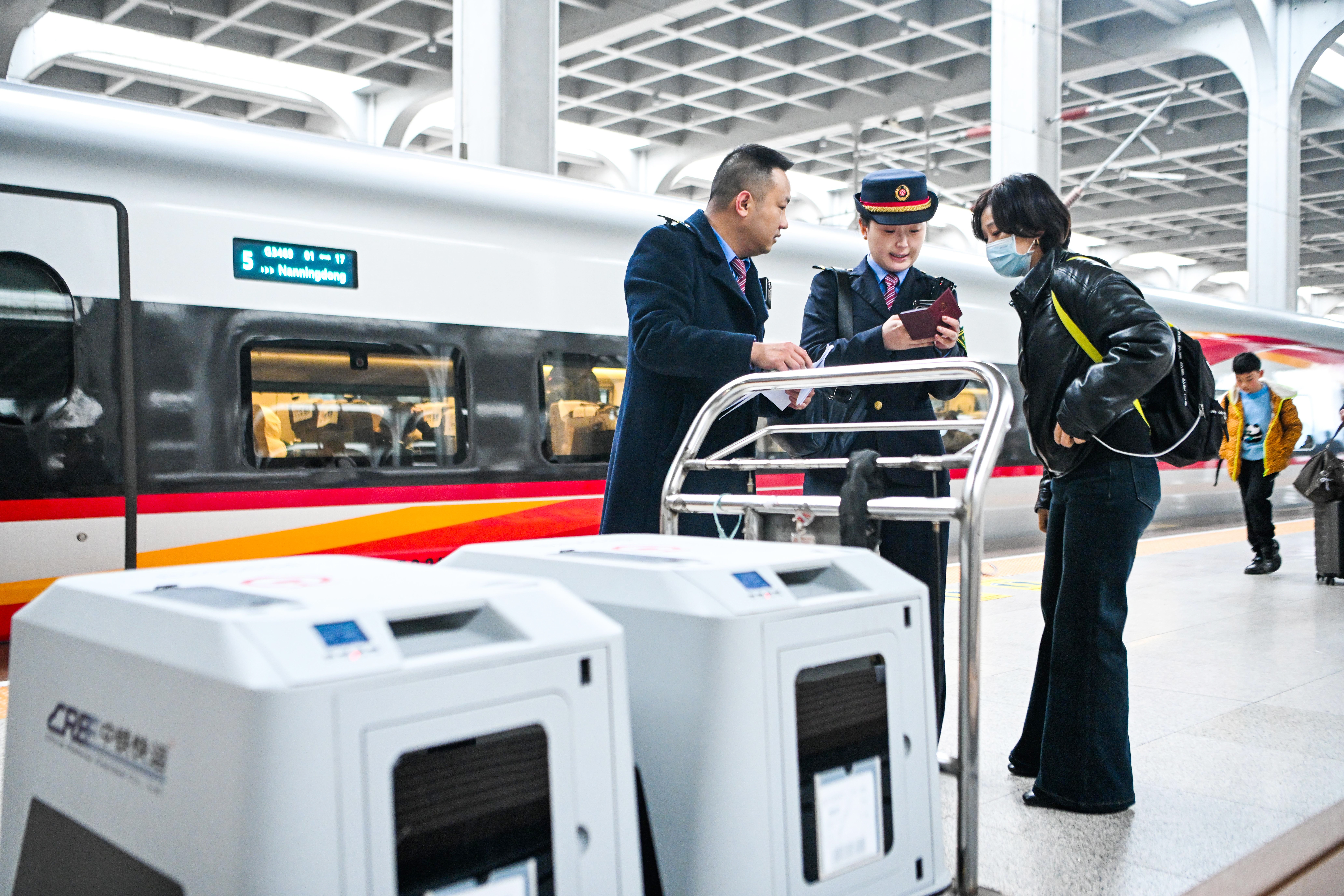 2月9日,铁路工作人员在重庆西站站台上办理宠物托运交接手续。 今年春运,重庆铁路部门在部分线路试点推出高铁宠物托运服务,以满足旅客携带宠物出行的需求。 据悉,托运服务采用“人宠同车、到达同站”模式,旅客通过12306App提前预约,即可为符合条件的猫犬办理托运手续。宠物将被安置在具备通风和温度、湿度监测系统的专用运输箱内,在确保安全的同时,也避免了干扰其他旅客。新华社记者 唐奕 摄