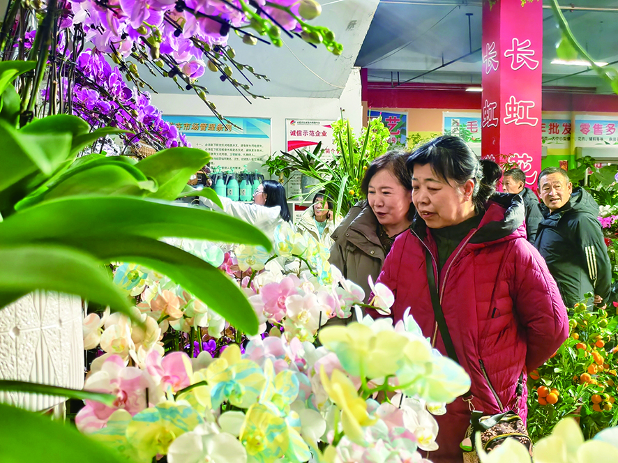 与此同时,花卉市场也迎来一年中最繁忙的时节。走进长虹花卉市场,沁人心脾的花香扑面而来,蝴蝶兰、仙客来、水仙、红掌等年宵花竞相绽放,寓意“鸿运当头”“大吉大利”“吉祥顺遂”的品种很受市民青睐。店主们忙着整理花枝、打包鲜花,耐心应答顾客的咨询,手脚不停却满脸笑意。不时有市民捧着挑选好的鲜花从店铺走出,为家里增添节日生机。市民张女士带着母亲一同挑选花卉,最终选定了一盆淡紫色蝴蝶兰和两盆红掌。“蝴蝶兰优雅,红掌寓意‘鸿运当头’,家里摆上这些花,年味才足,看着也舒心。”张女士说。