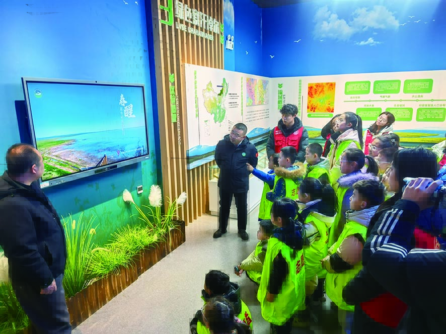 活动首站设在察汗淖尔国家湿地公园科普馆。讲解员通过图文展板、互动沙盘及多媒体设备,向大家系统讲解湿地“地球之肾”“物种基因库”的生态功能,介绍察汗淖尔湿地跨蒙冀两省的流域概况与生态保护成效。在生物多样性展示区,蝴蝶标本、鸟类图鉴以及大天鹅、遗鸥等珍稀鸟类的相关介绍,吸引大家驻足观看。参与者认真聆听湿地植被与昆虫共生、冬季留鸟投喂、冰下水生生物保护等知识,生态保护意识在潜移默化中得到增强。