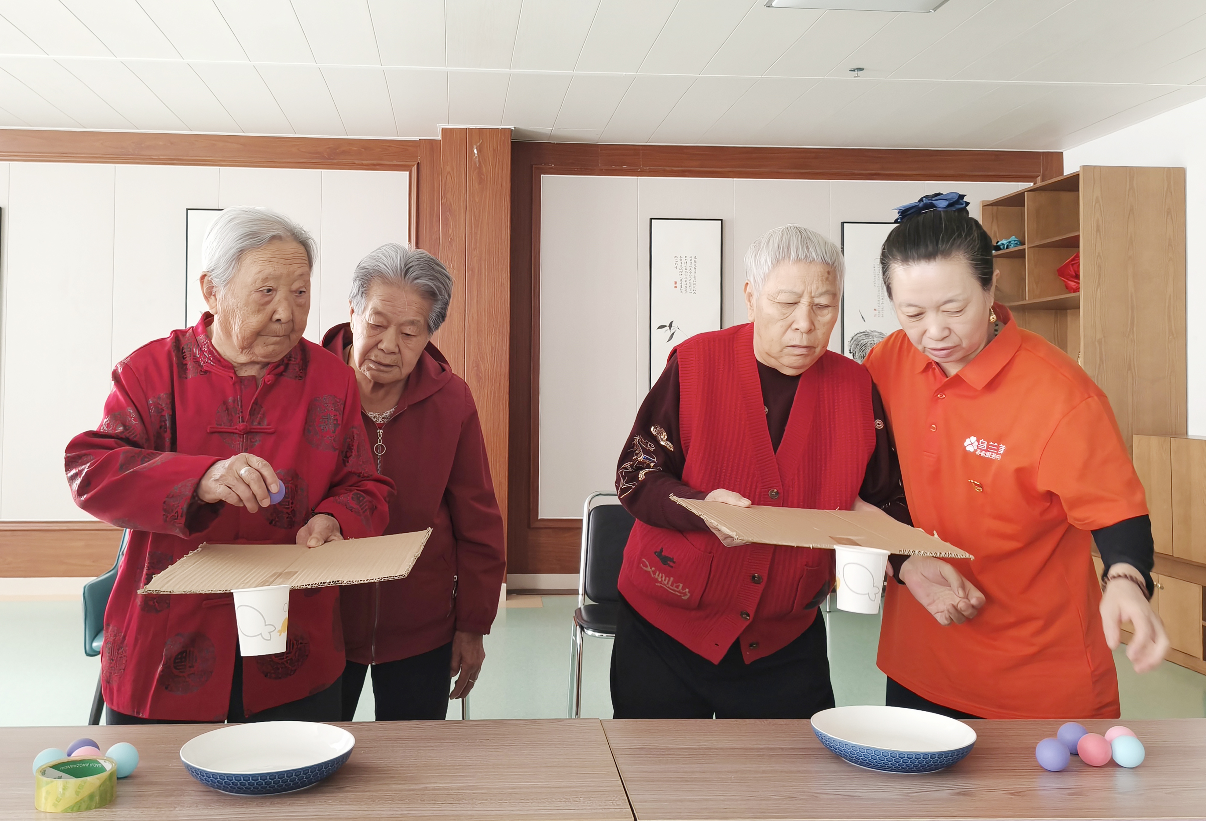 “我们今天的游戏是‘平板滚球’,两人一组参赛,用纸板运送乒乓球至纸杯,先完成运送者获胜。”工作人员刚宣布完规则,活动室的老人们便纷纷结伴组队,跃跃欲试。老人们两两配合,小心翼翼地用纸板托住乒乓球平稳运送,专注地将球送入纸杯。一旁围观的老人自发当起啦啦队,鼓劲声、欢笑声、喝彩声此起彼伏,整个活动室内热闹非凡。