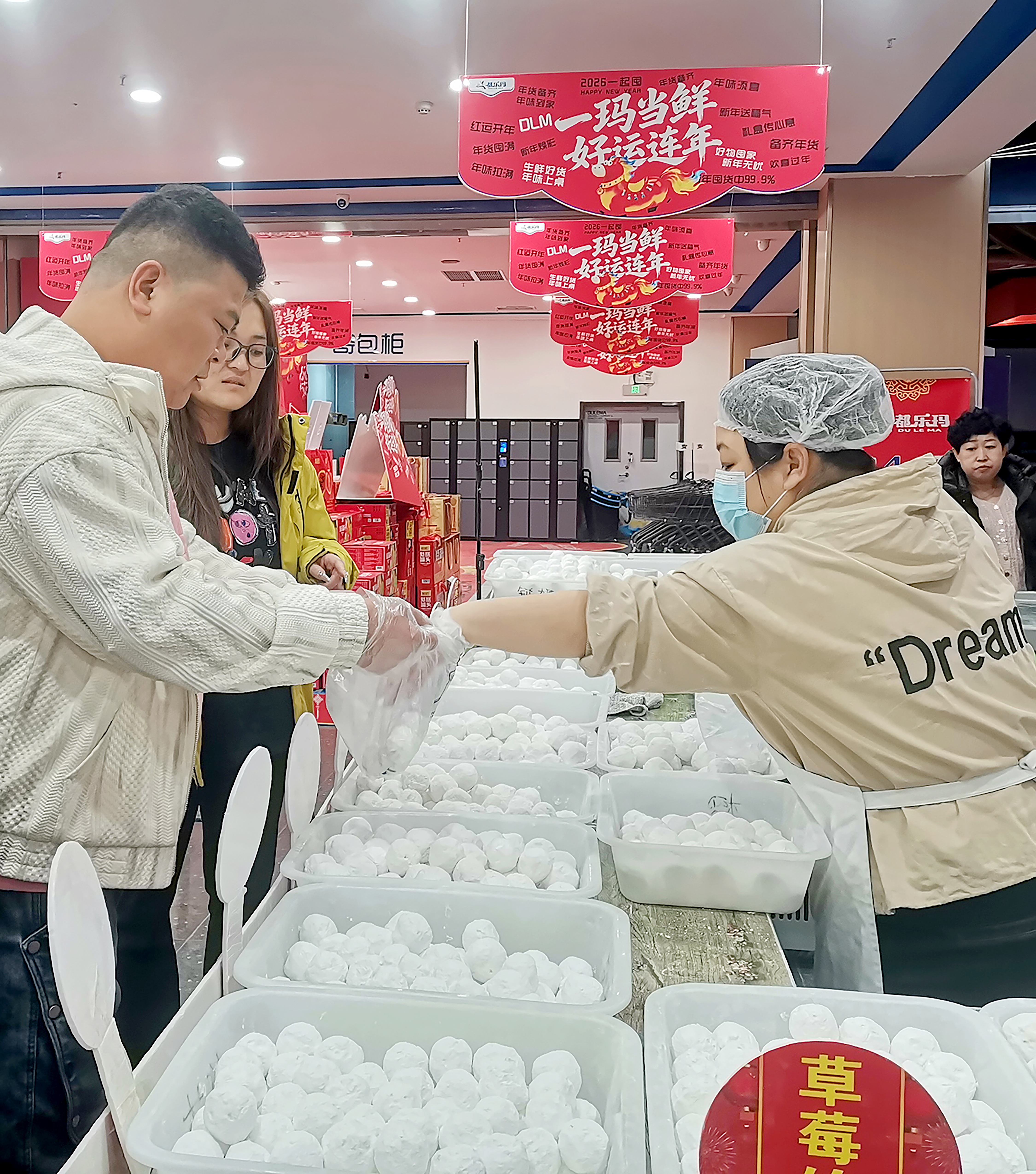 工作人员正在忙碌地制作手工元宵。 市民选购手工元宵。 3月1日,元宵节前夕,记者走访集宁区多家超市发现,手工现制元宵成为市民欢庆元宵节的热门选择。 在集宁区都乐玛超市的元宵售卖区,现场制作的元宵摊位前人头攒动。工作人员正熟练地将糯米粉与馅料混合,手工搓制出一颗颗圆润饱满的元宵。透明的塑料盒里,整齐码放着黑芝麻、五仁、草莓等多种口味的元宵,吸引了不少市民驻足挑选。 本报记者 王伟 摄