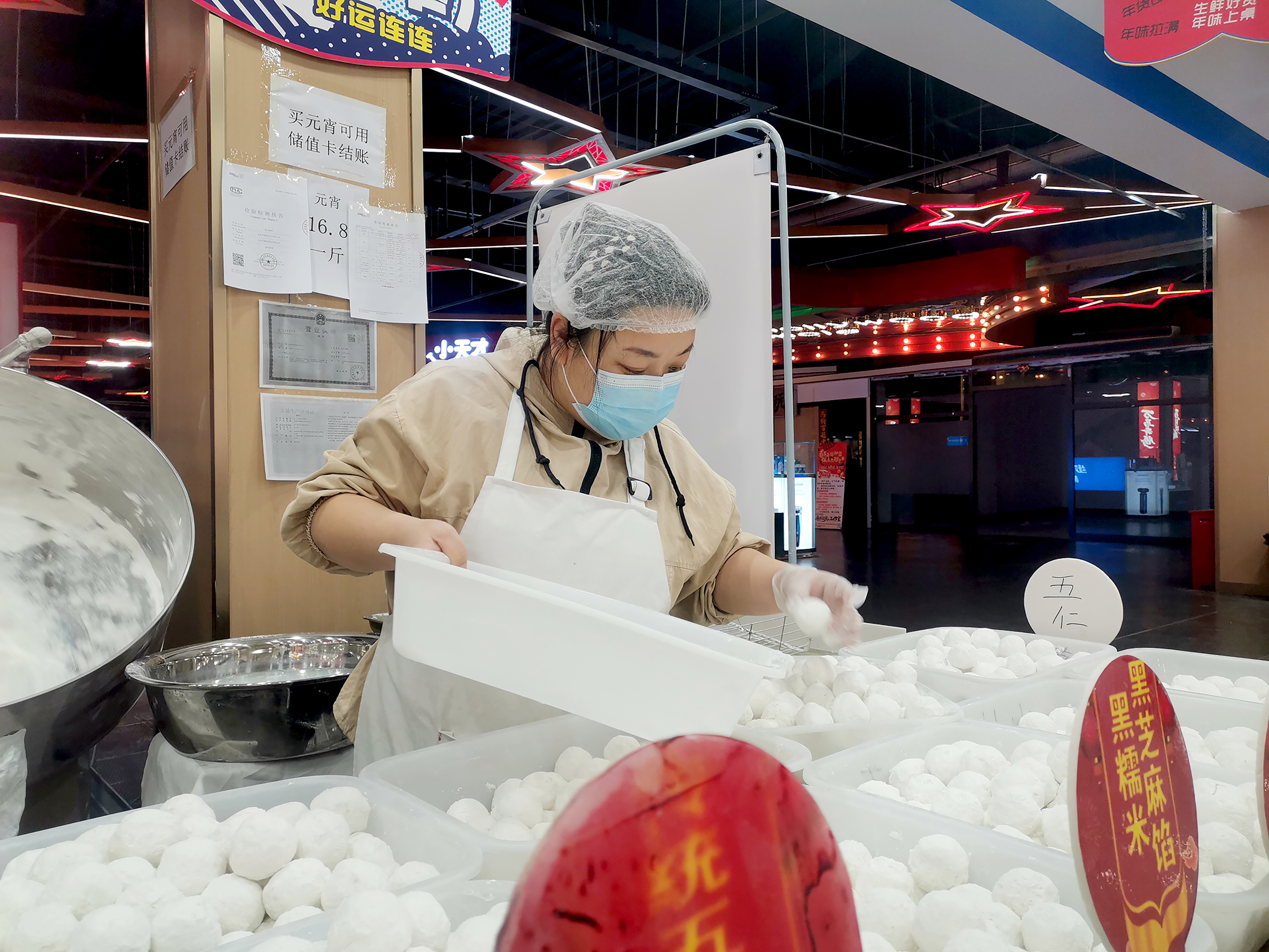 工作人员正在忙碌地制作手工元宵。