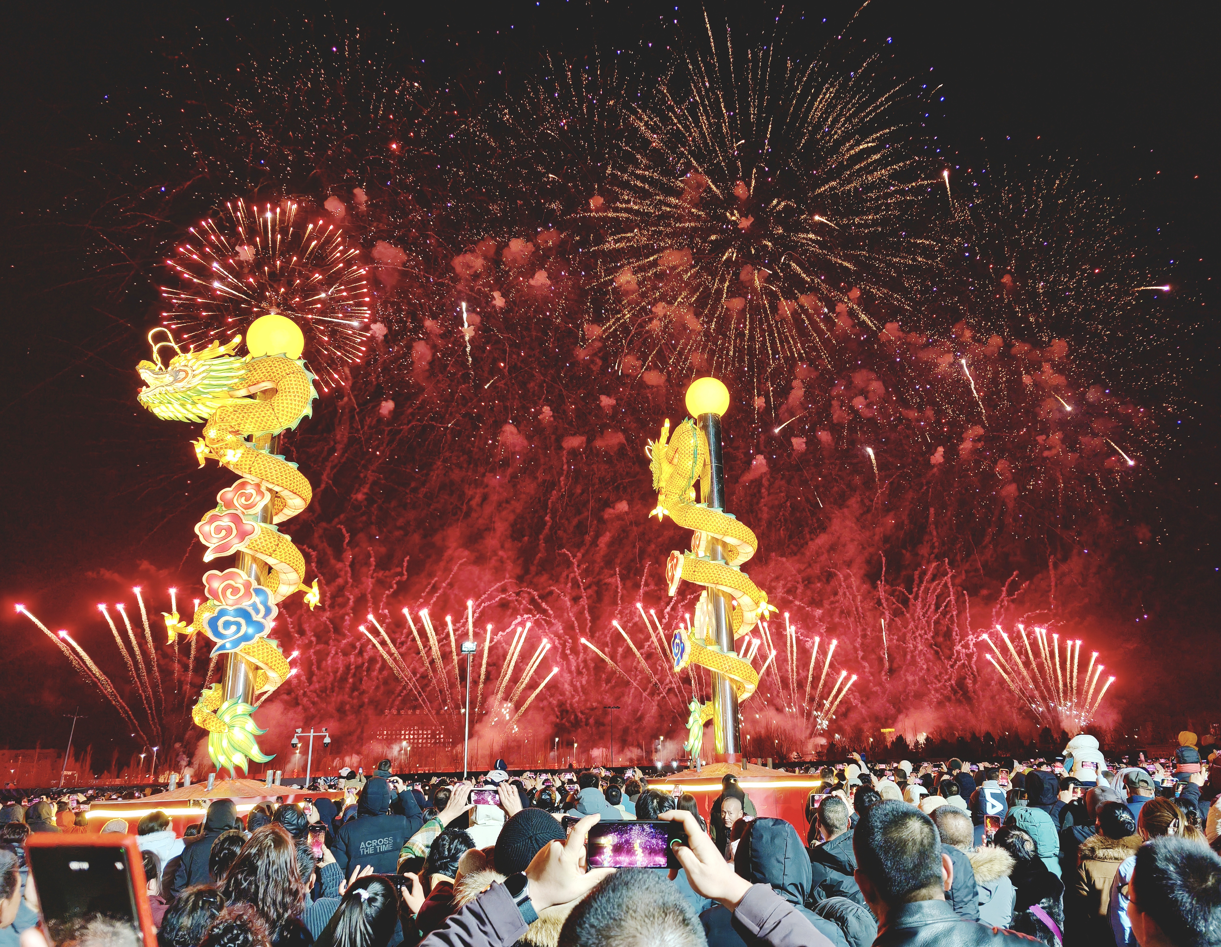 晚8时58分,活动迎来最高潮。随着一阵阵轰鸣声,大型烟花秀开始了,烟花在夜空绽放,五彩斑斓的焰火如流星般洒落,金色的、红色的、紫色的光芒交织辉映,将街区夜空装点得璀璨夺目。与此同时,数百架无人机腾空而起,在夜空中变换出多种字样和造型,引得现场游客阵阵惊呼,纷纷举起手机记录这震撼瞬间。光影交错中,欢呼声、惊叹声此起彼伏,整个街区沉浸在一片欢乐的海洋里。
