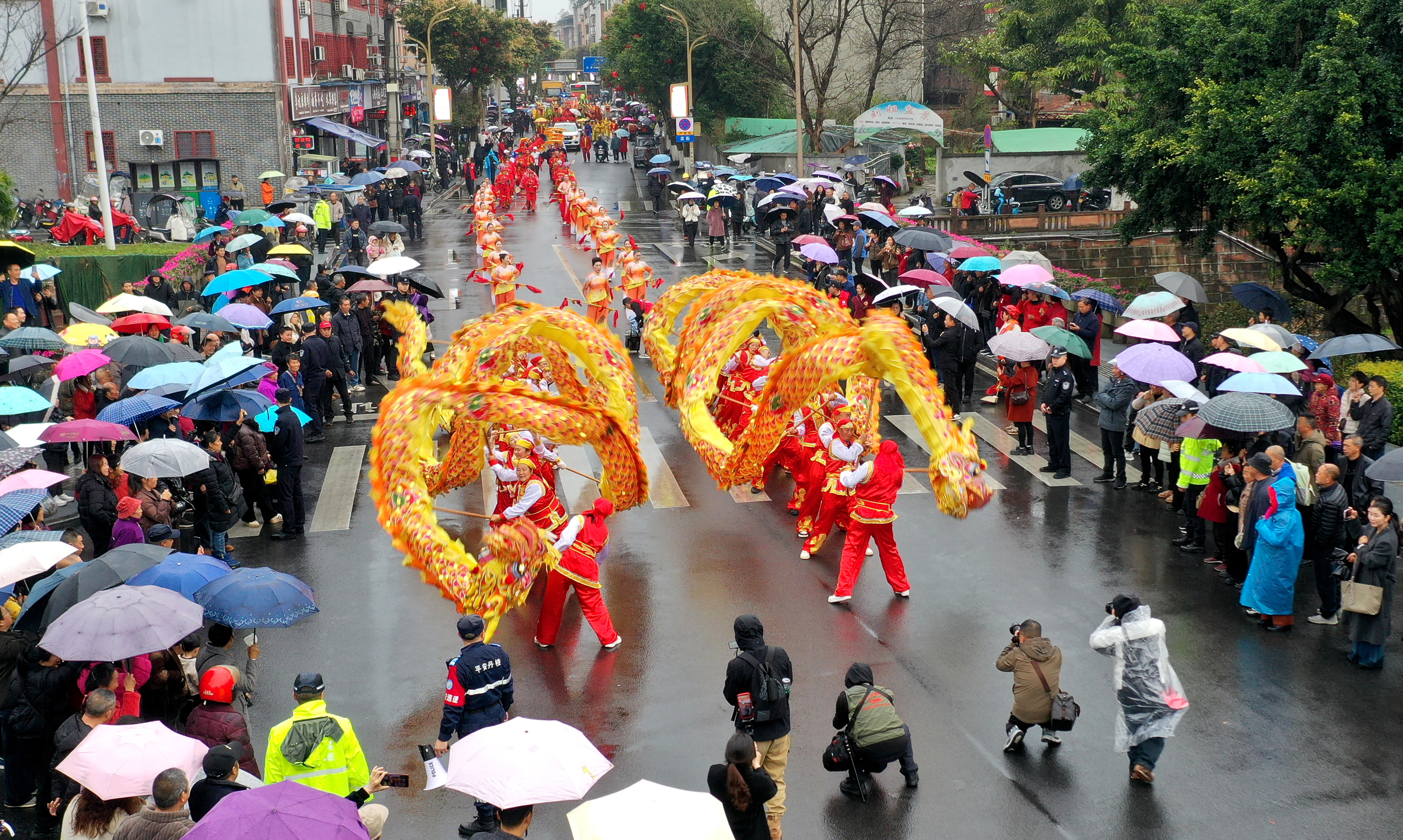 3月3日,演员在四川省眉山市丹棱县的元宵巡游活动中表演舞龙(无人机照片)。