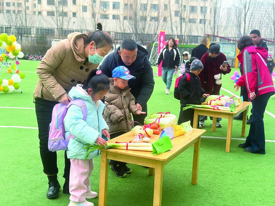 在园内另一侧的“民俗祈福区”,一张张木桌上整齐摆放着大葱、白菜、大蒜、苹果等寓意吉祥的物品。孩子们在老师的引导下,好奇地触摸、观察这些“开学吉祥物”,在家长的陪伴下完成打卡,感受传统民俗的魅力。“大葱代表聪明伶俐,白菜寓意百事顺遂。”陪同孩子参与活动的家长李先生表示,“园方把传统文化融入开学仪式,让孩子在潜移默化中了解民俗,这种教育方式很有意义。”