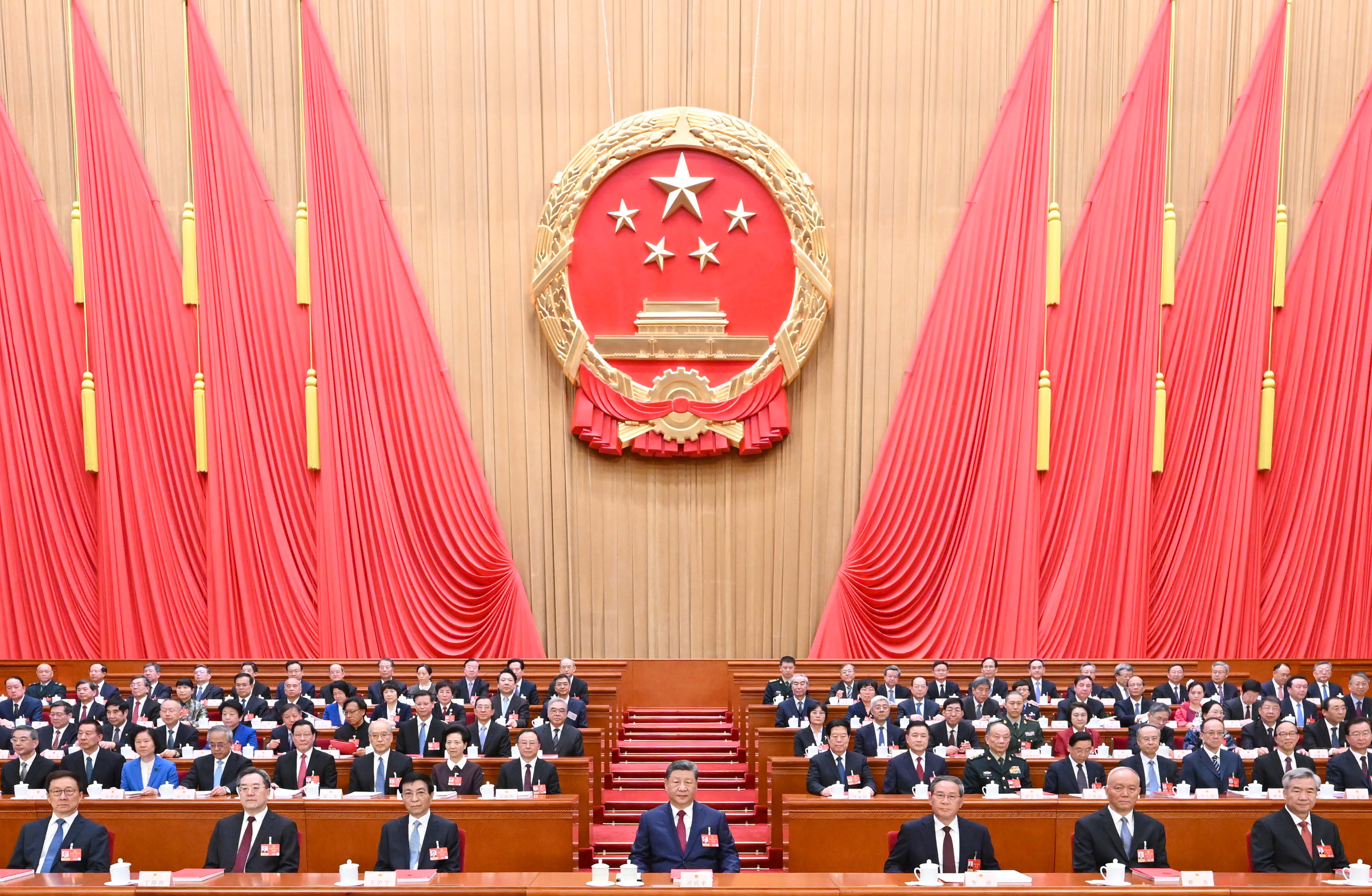 3月12日下午,第十四届全国人民代表大会第四次会议在北京人民大会堂闭幕。党和国家领导人习近平、李强、王沪宁、蔡奇、丁薛祥、李希、韩正等在主席台就座。新华社记者 谢环驰 摄