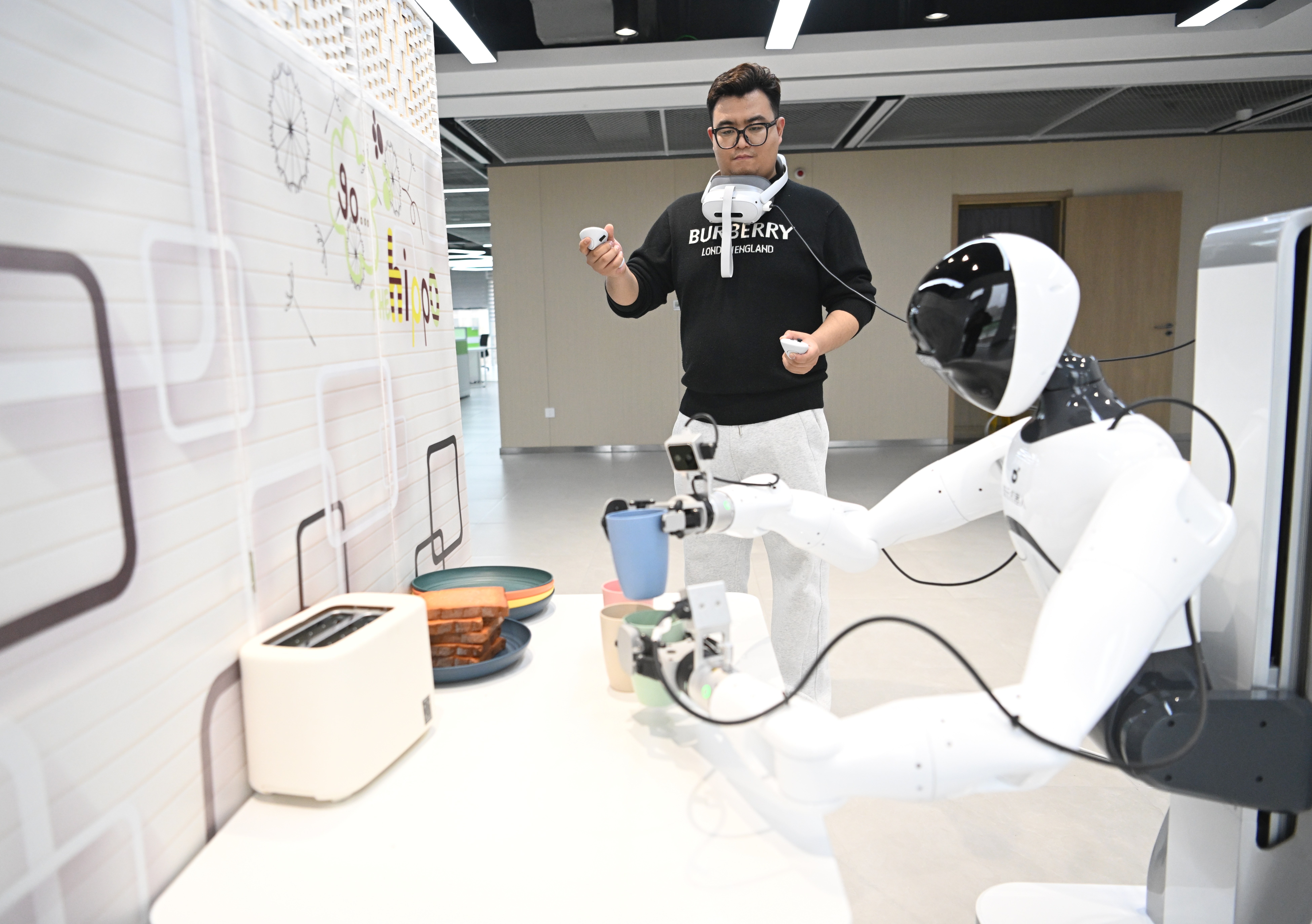 3月17日,在中国雄安集团数字城市科技有限公司具身智能训练场,工作人员对机器人进行具身智能训练。 日前,中国雄安集团数字城市科技有限公司具身智能训练场正式投入使用,该训练场采用1∶1实景还原,打造了机器人迎宾导览、工业搬运、家居生活、商业零售、物流装配五大真实场景,开展常态化真机数据采集与标注,收集到的数据向社会开放,助推具身智能技术在城市复杂场景中的规模化应用与商业化落地。 新华社记者 朱旭东 摄