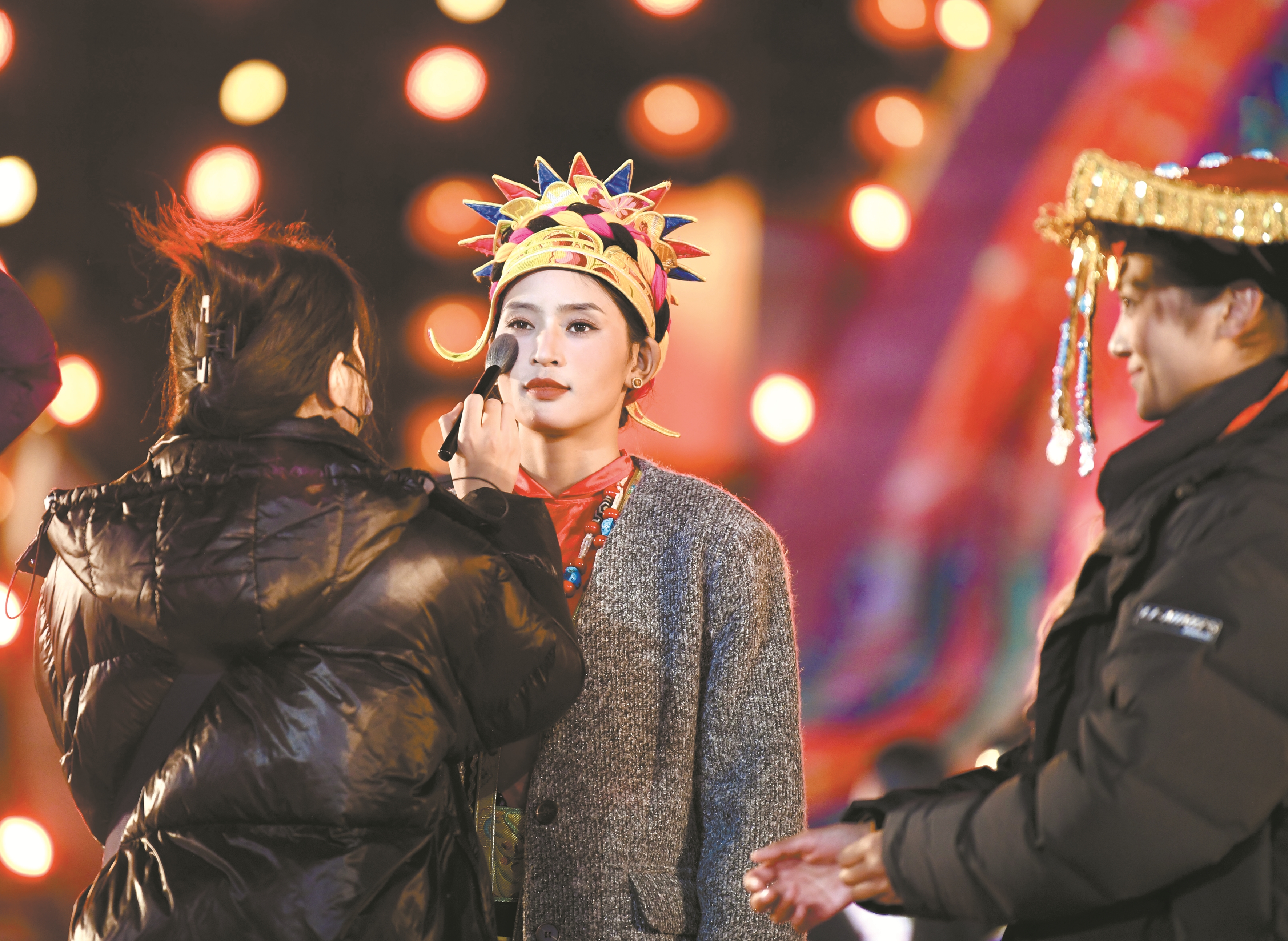 图?为参加总台春晚拉萨分会场的演职人员在彩排前化妆。