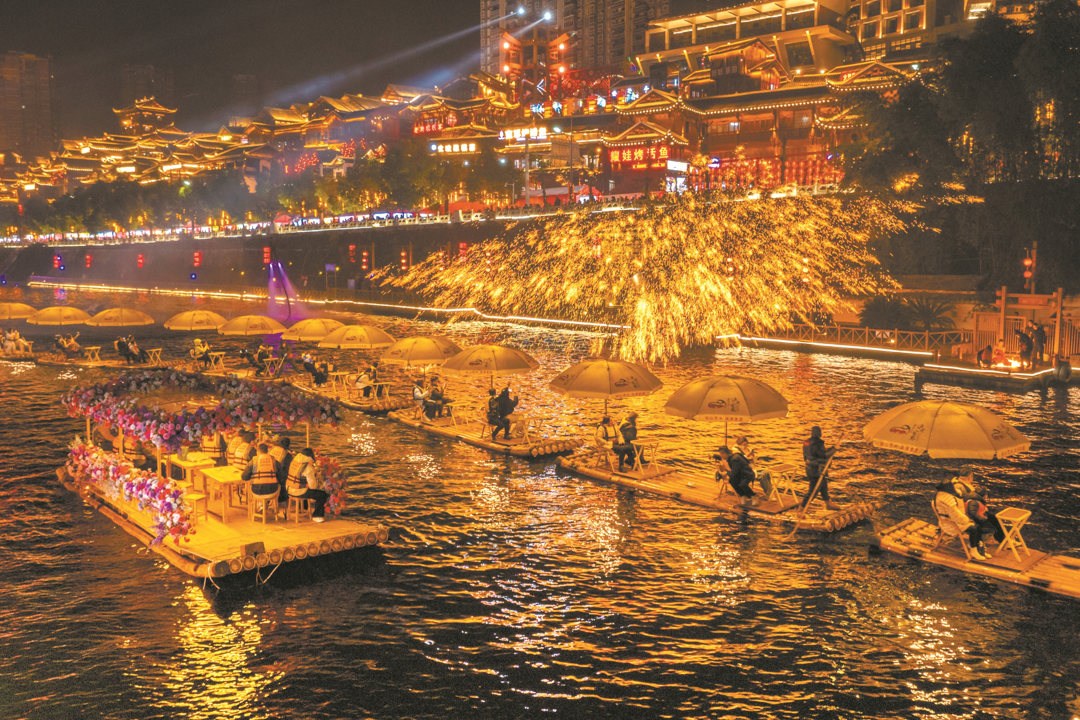 →这是1月26日,人们在湖北省恩施土家族苗族自治州宣恩县城观看打铁花表演(无人机照片)。