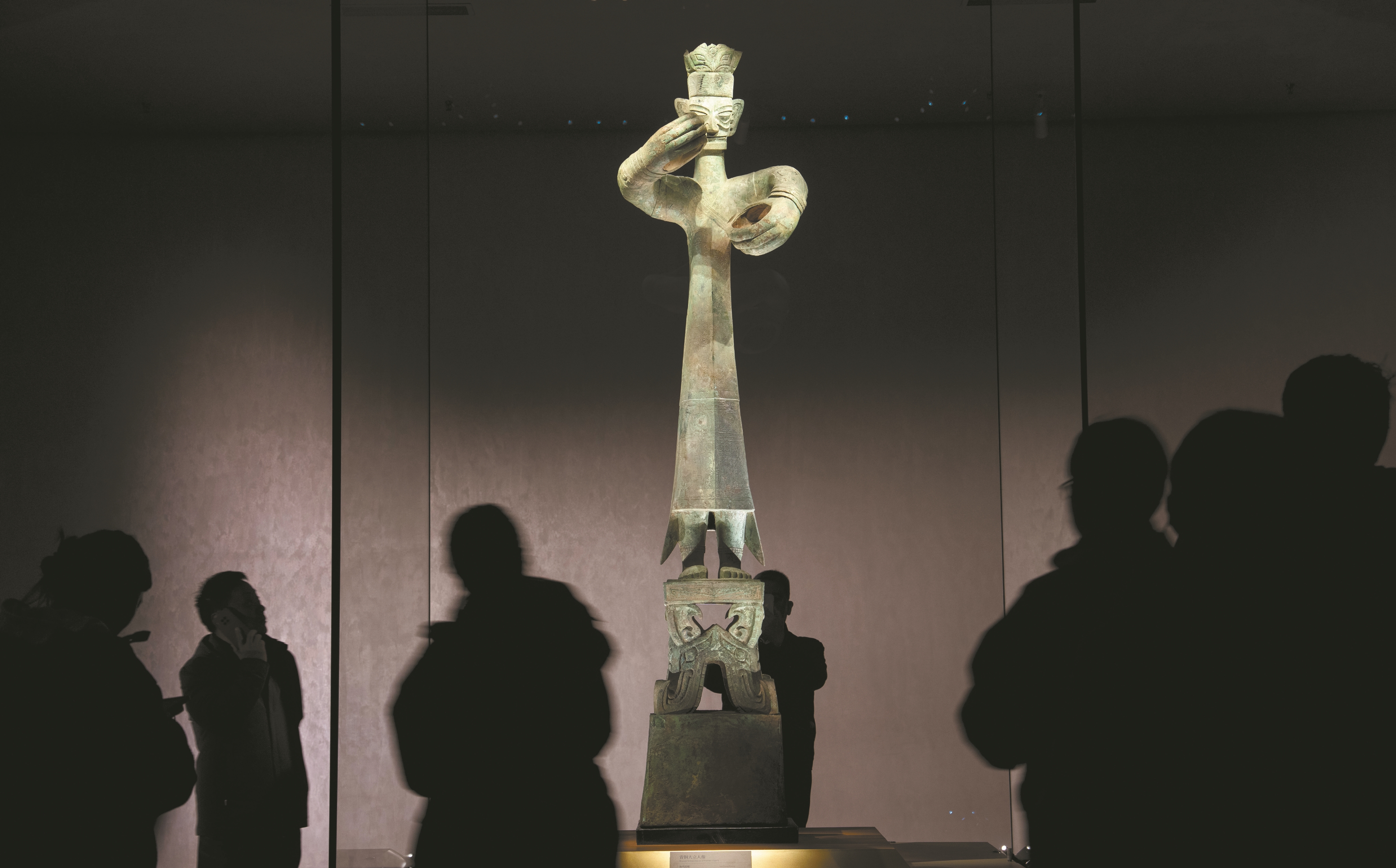 图③观众在三星堆博物馆新馆展厅内参观青铜大立人像(2024年12月18日摄)。