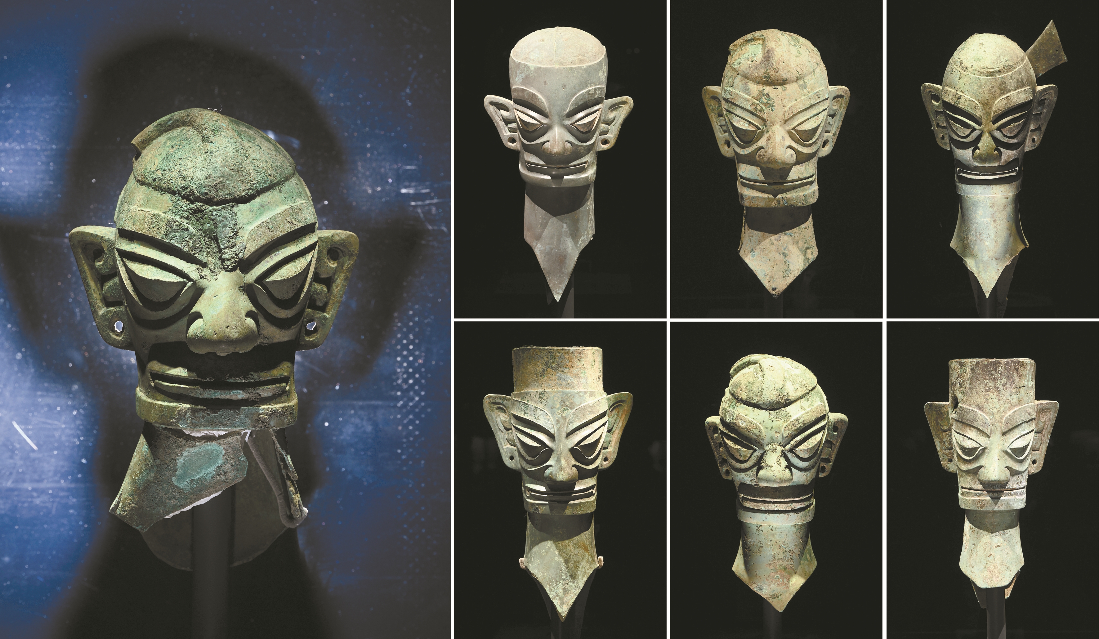 图①为2021年出土于三星堆3号祭祀坑的青铜人头像(左一)和2022年出土于三星堆8号祭祀坑的青铜人头像(2024年12月19日摄,拼版照片)。