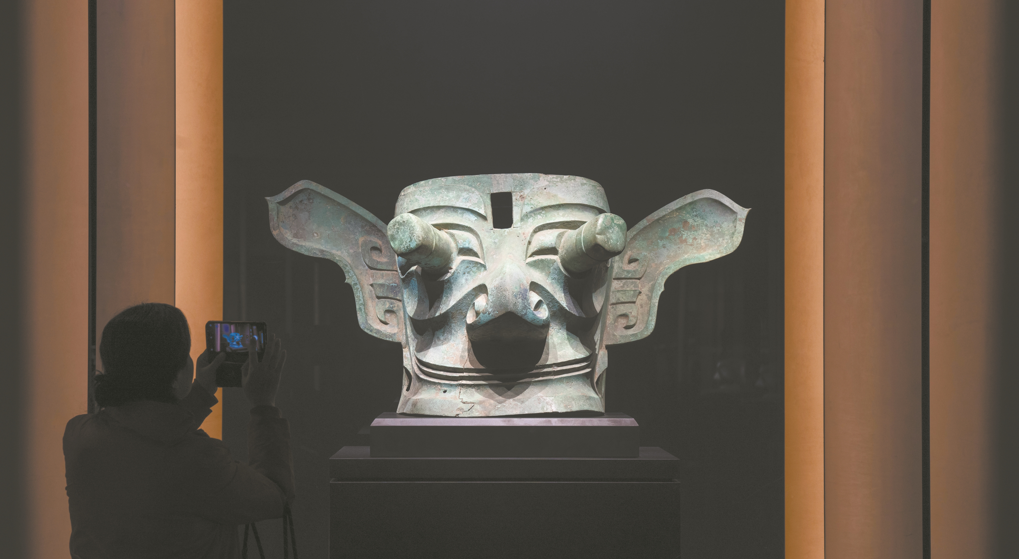 图④为2024年12月18日在三星堆博物馆新馆拍摄的青铜纵目面具。(新华社发)