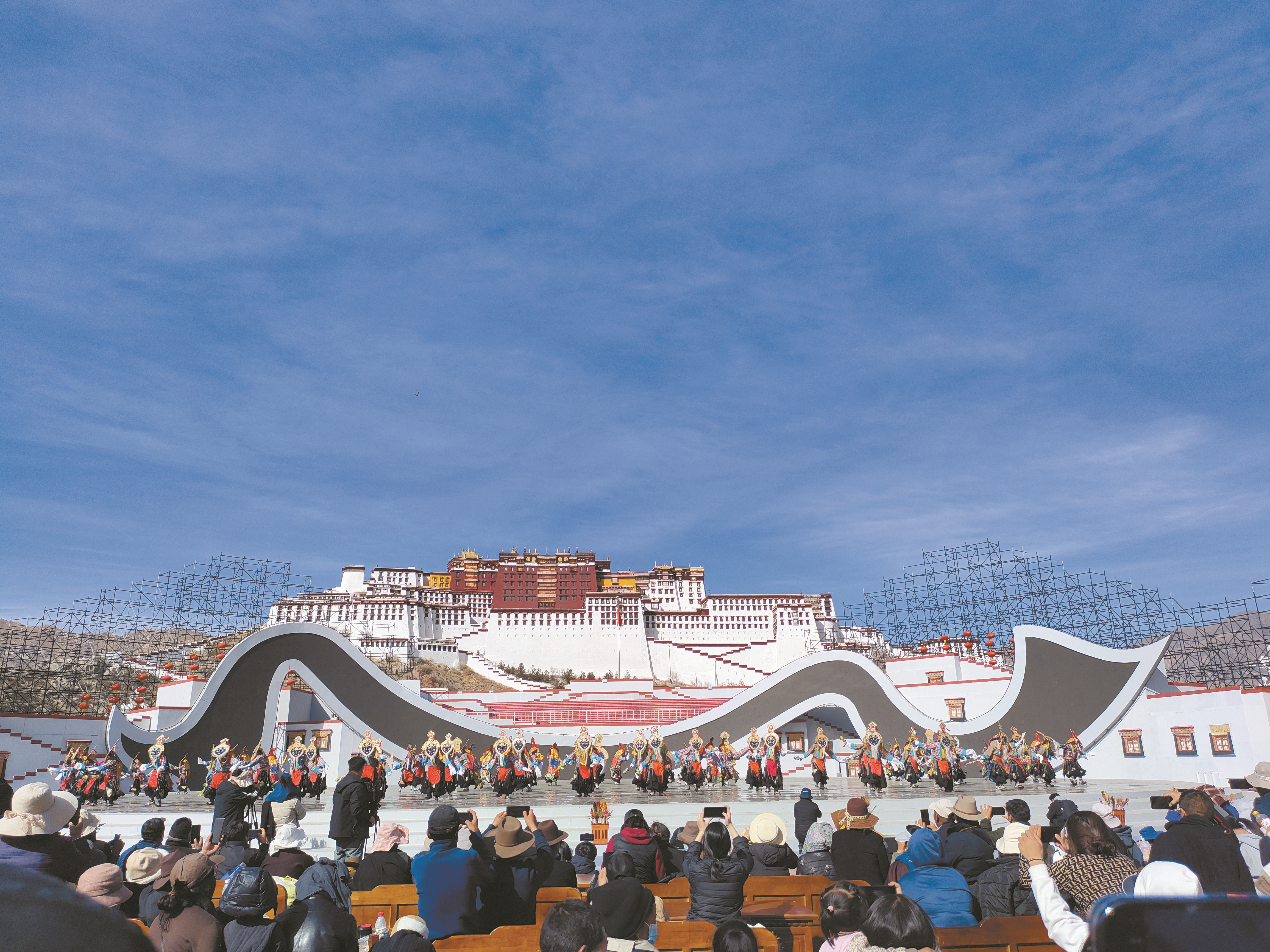 此次文艺演出充分利用总台春晚拉萨分会场搭建好的舞台,以雄伟的布达拉宫为背景,进行形式多样的文艺展示。由堆龙德庆区民间藏戏团带来的藏戏《古韵祥和》拉开了演出序幕,演员们身着色彩斑斓、独具民族特色的传统戏服,伴随着铿锵有力的锣鼓节奏舞动,高昂嘹亮的唱腔更是极具感染力,瞬间吸引了现场观众的注意力。大家沐浴着冬日的暖阳,听着优美的藏戏,个个脸上洋溢着幸福的笑容。