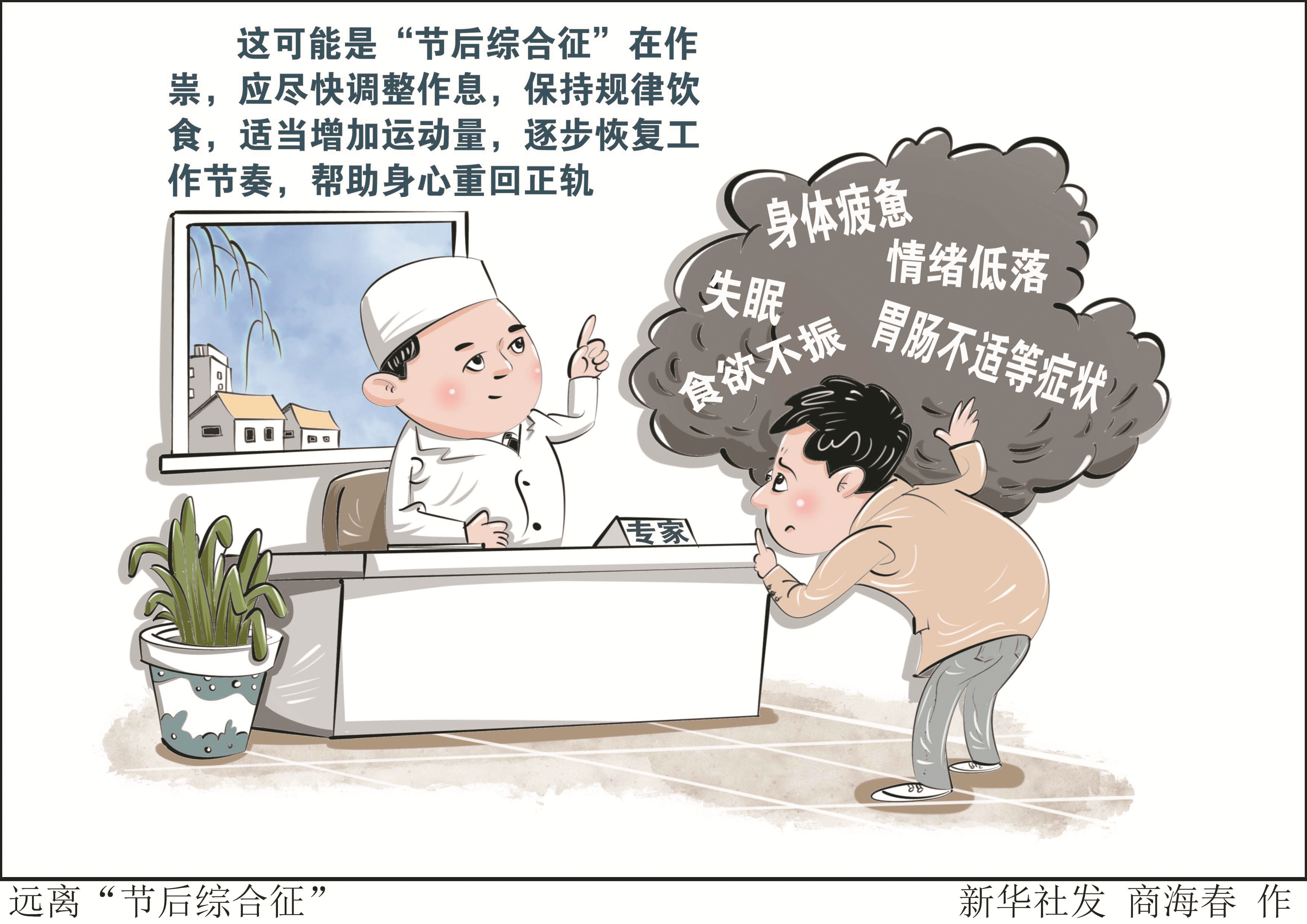 新华社大连2月4日电(记者张博群)春节假期接近尾声,开工在即,一些人出现了身体疲惫、情绪低落、失眠、食欲不振以及胃肠不适等症状。专家提醒,这可能是“节后综合征”在作祟,应尽快调整作息,保持规律饮食,适当增加运动量,逐步恢复工作节奏,帮助身心重回正轨。