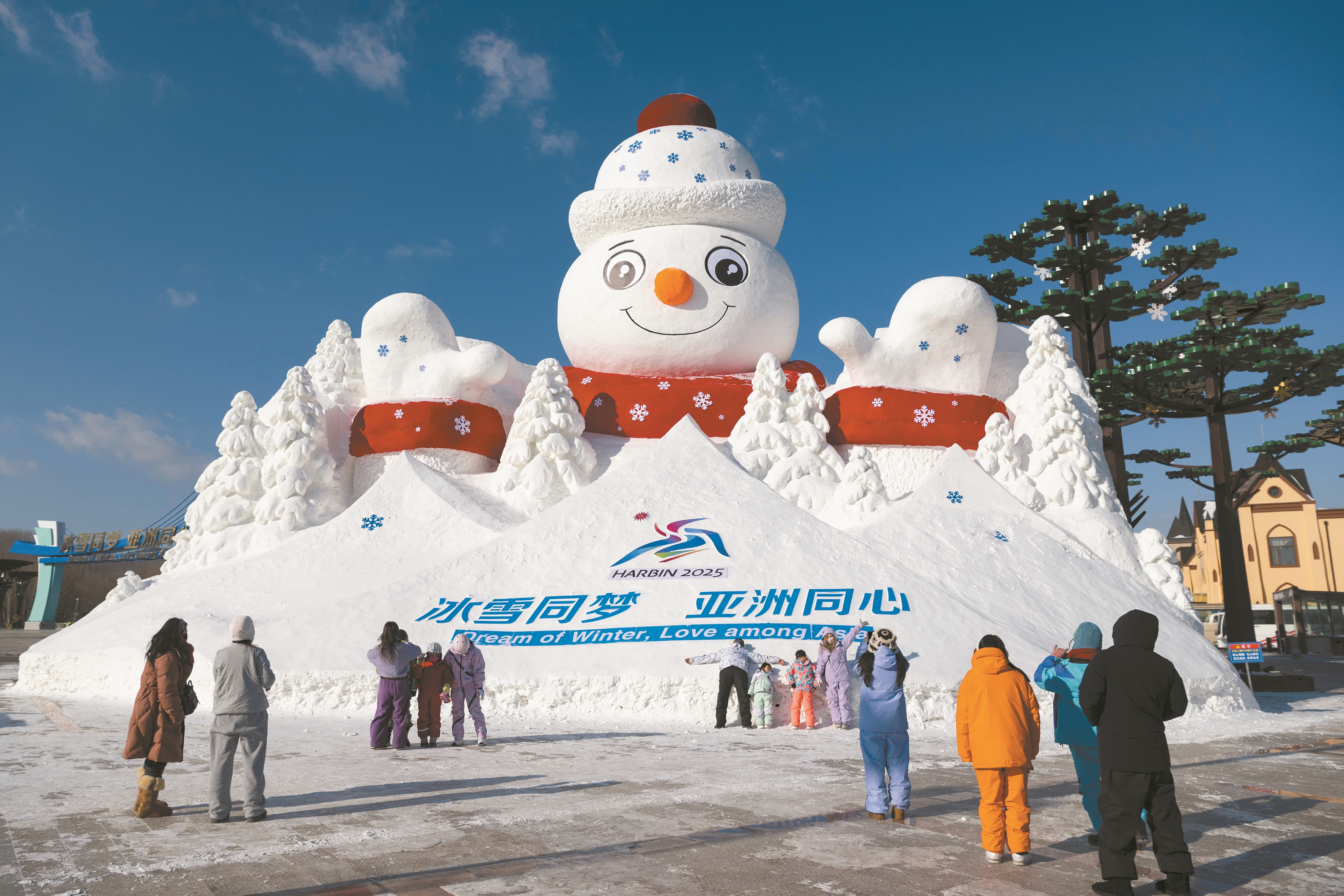 图为在亚雪公路沿线的亚布力滑雪旅游度假区,游客在《惊喜的大雪人》雪雕前游玩(2025年1月16日摄)。 新华社记者 谢剑飞摄