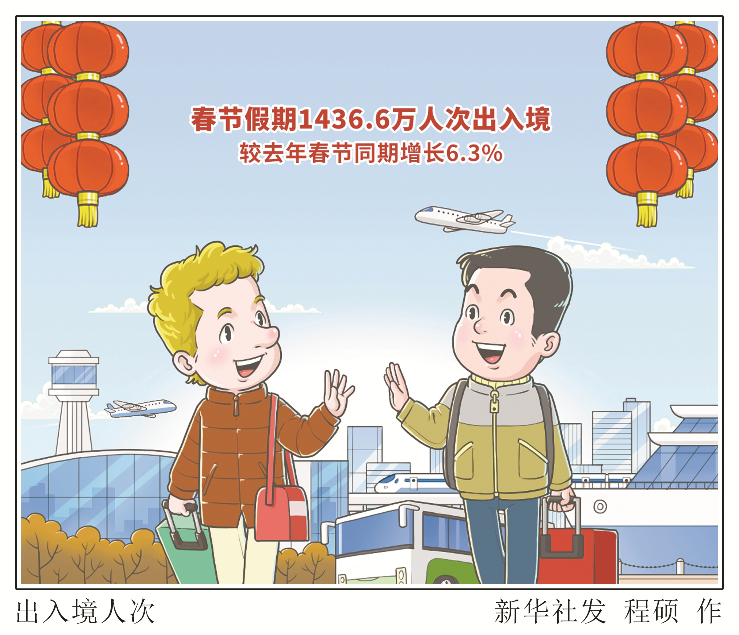 记者2月5日从国家移民管理局获悉,今年春节假期全国边检机关共计保障1436.6万人次中外人员出入境,较去年春节同期增长6.3%。其中,内地居民出入境767.1万人次,较去年春节同期增长5%;港澳台居民573.7万人次,较去年春节同期增长5.6%;外国人95.8万人次,较去年春节同期增长22.9%。共计查验出入境交通运输工具52.5万架(艘、列、辆)次,较去年春节同期增长14.4%,全国海陆空港口岸通关平稳有序。 (新华社发)