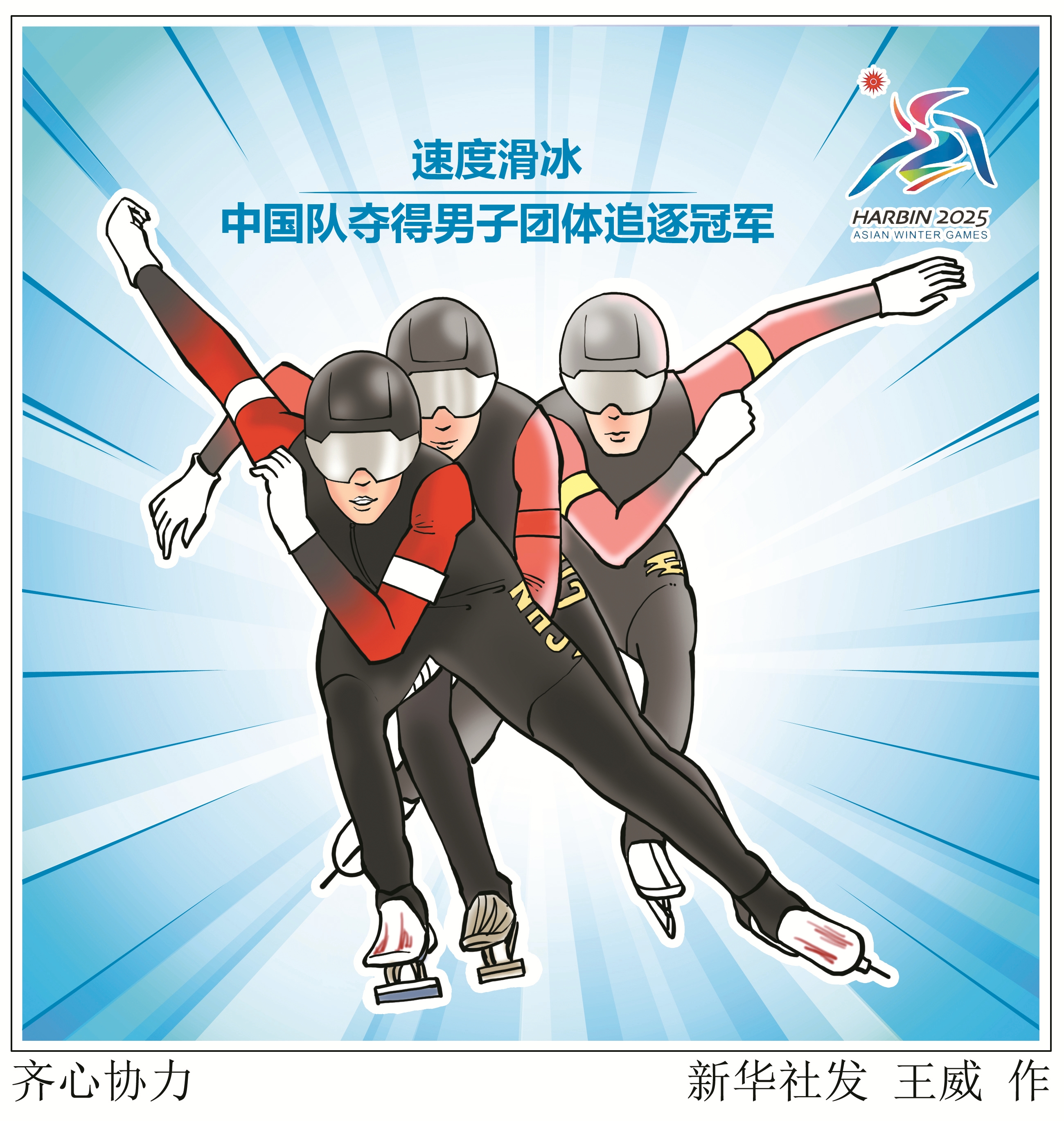 这是2月11日,第九届亚冬会速度滑冰男子团体追逐决赛在哈尔滨举行。中国队夺得冠军。 (新华社发)