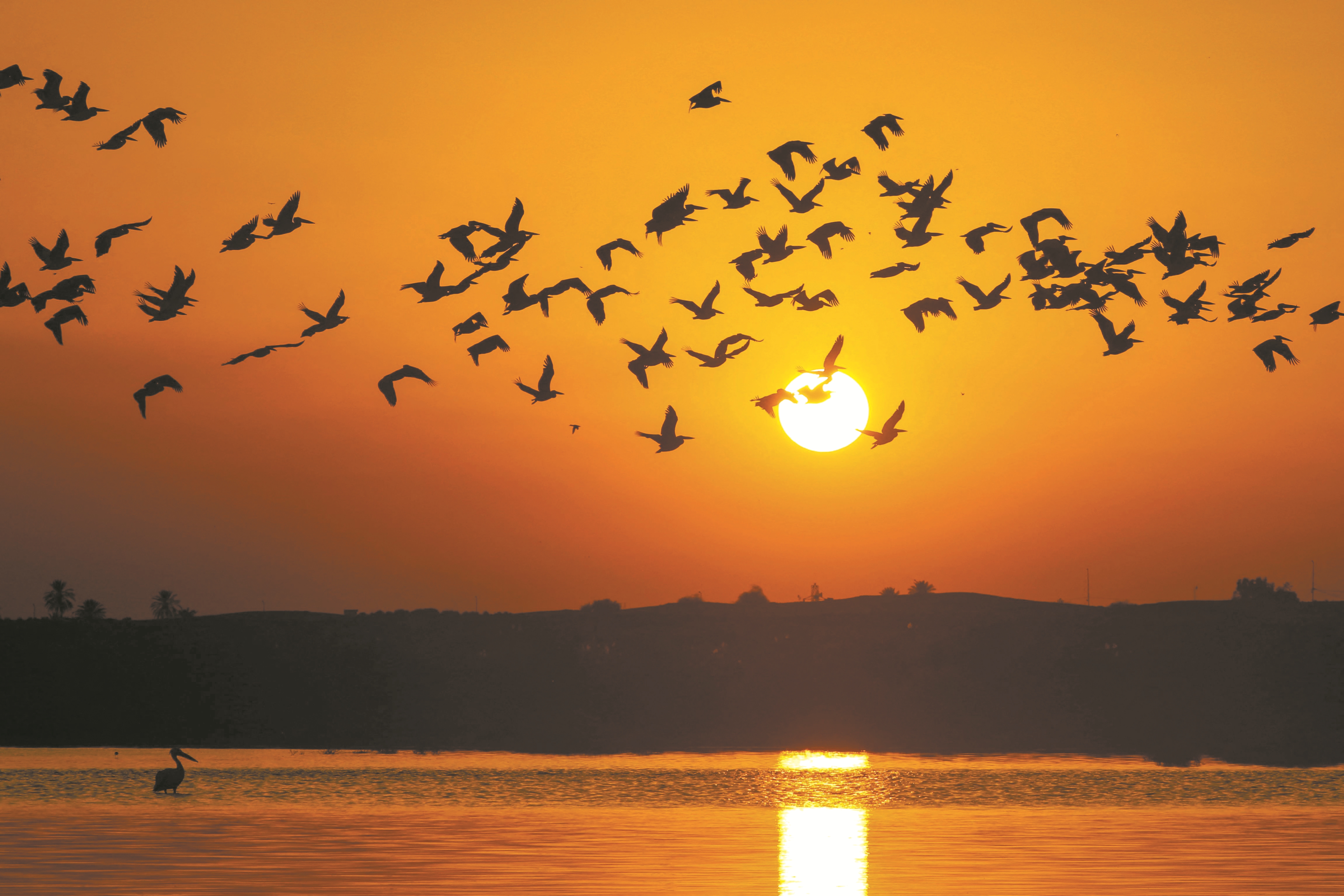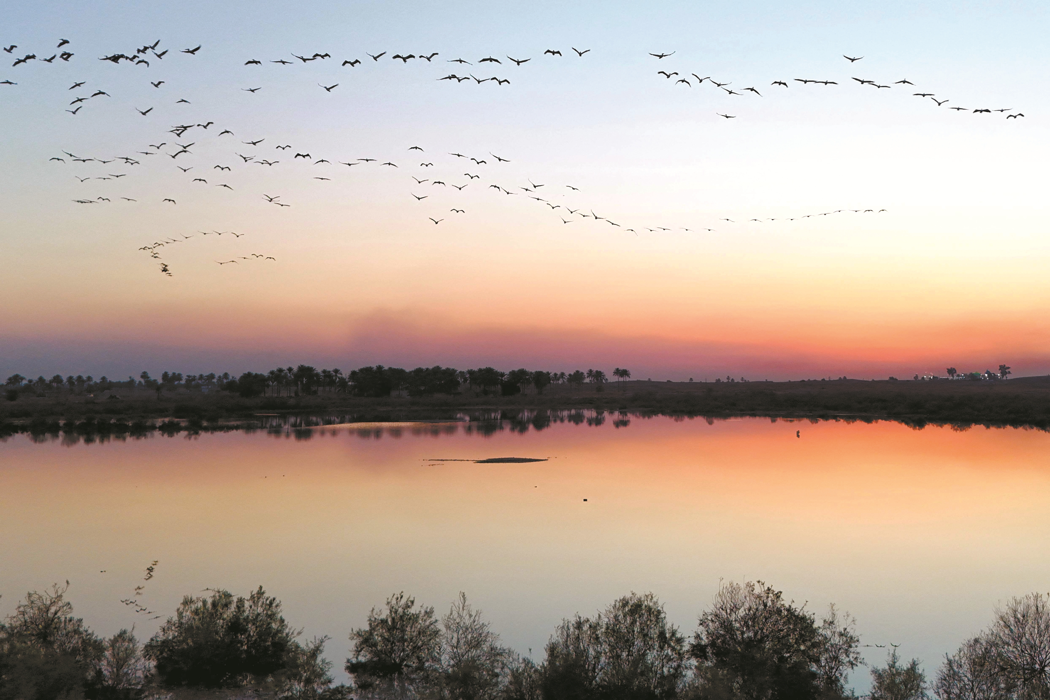 图为2月11日,在伊拉克中部希拉,鹈鹕在水面上低空飞行。