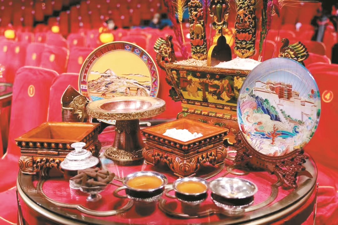 在拉萨分会场的民俗展示桌上,摆着来自西藏七市地的特色产品,拉萨的切玛、那曲的矿泉水、阿里古格的“盘”、山南泽帖尔的围巾、日喀则的青稞饼、林芝的苹果以及昌都的牦牛肉,这些极具地域特色的物品由分会场主持人朱迅和斯塔罗布来讲解。