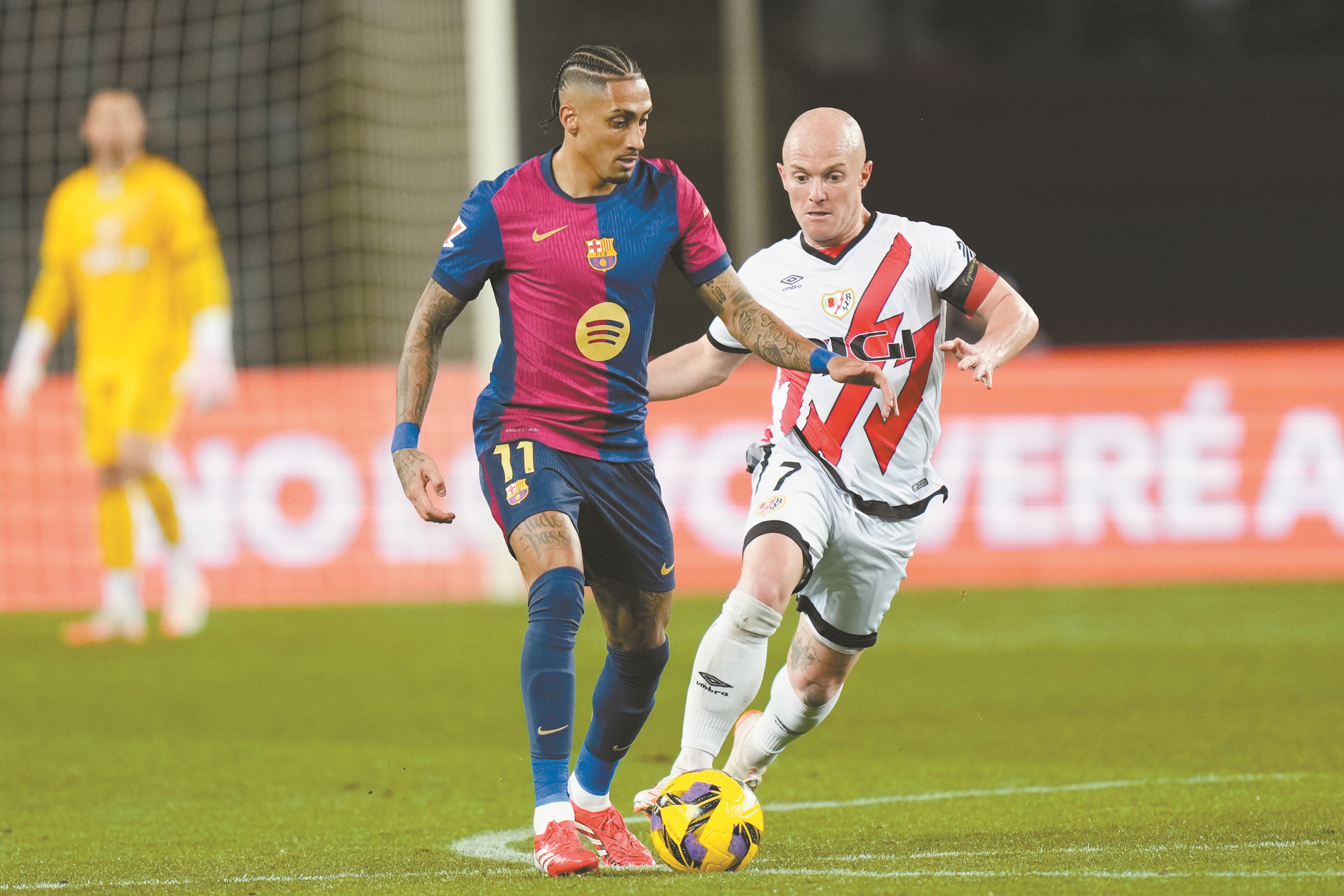 图为巴塞罗那队球员拉菲尼亚(左)与巴列卡诺队球员帕拉松拼抢。