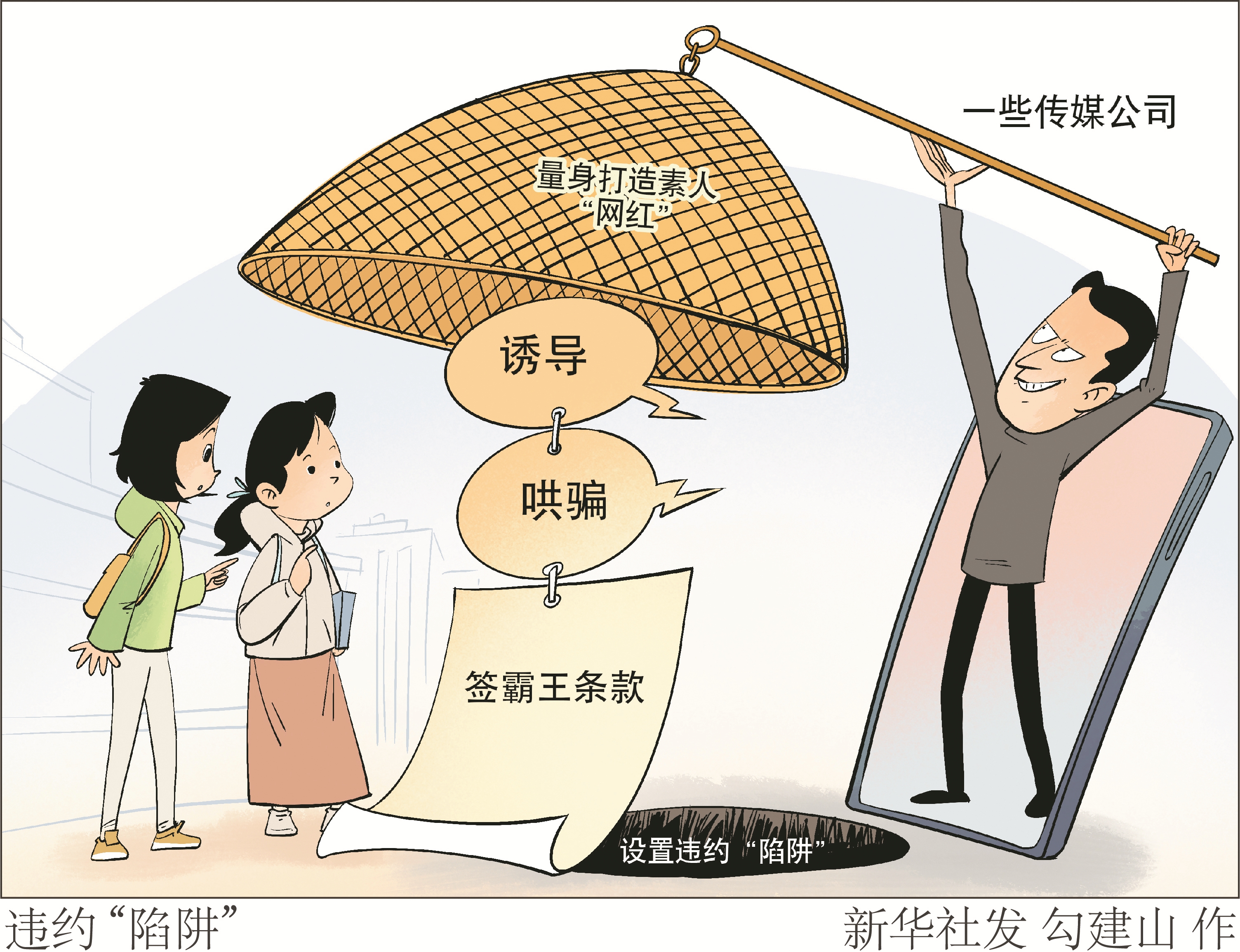 记者调查发现,这家传媒公司先是在网络平台有针对性地“广撒网”,再利用在校大学生不熟悉“网红”行业规则和相关法律条款,诱惑其签约,通过设计不公平的合同内容或进行虚假承诺,导致其陷入法律纠纷。