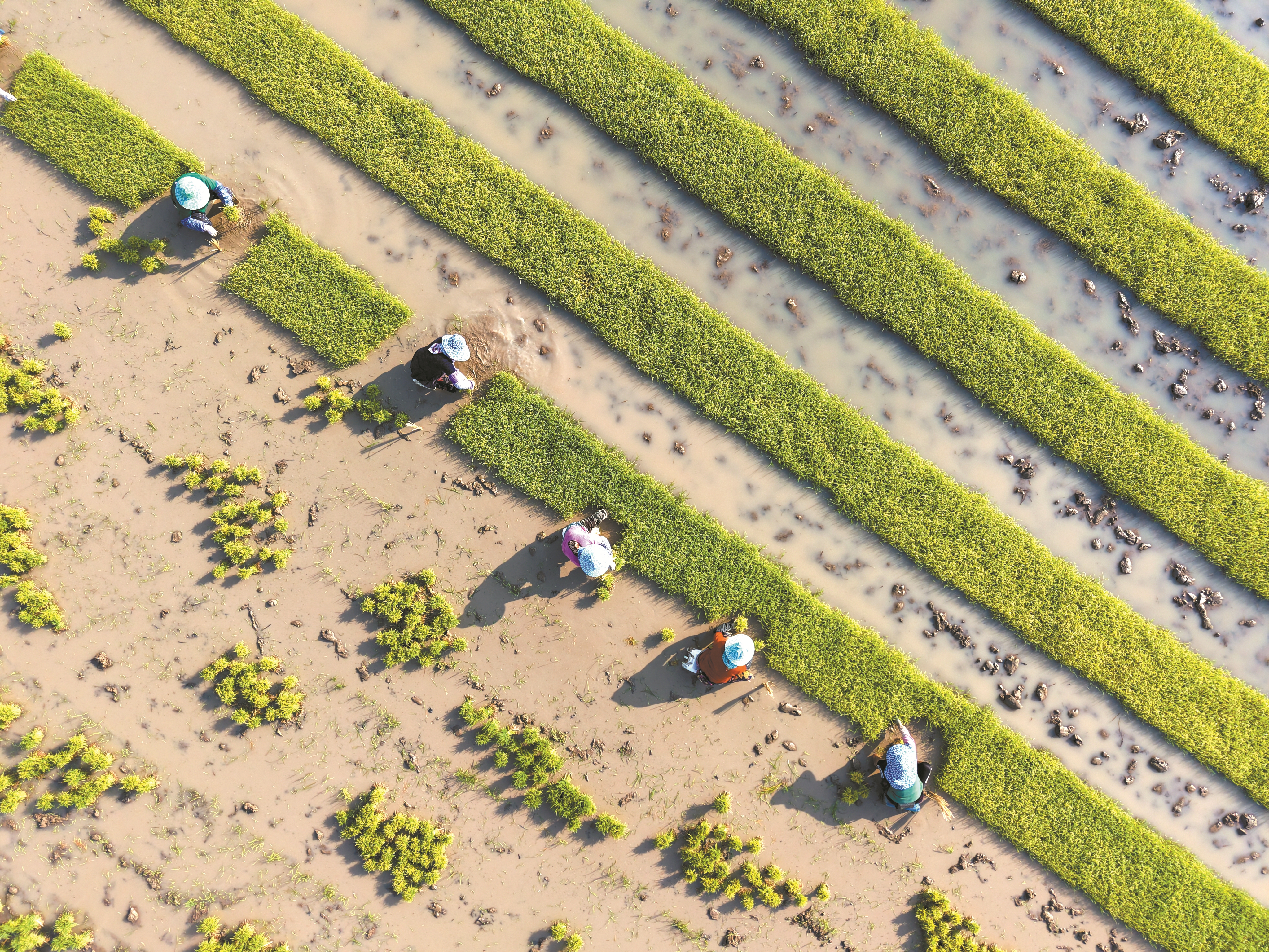 这是2月18日,在云南省西双版纳州勐海县勐遮镇曼拉村,农民在田间起秧(无人机照片)。