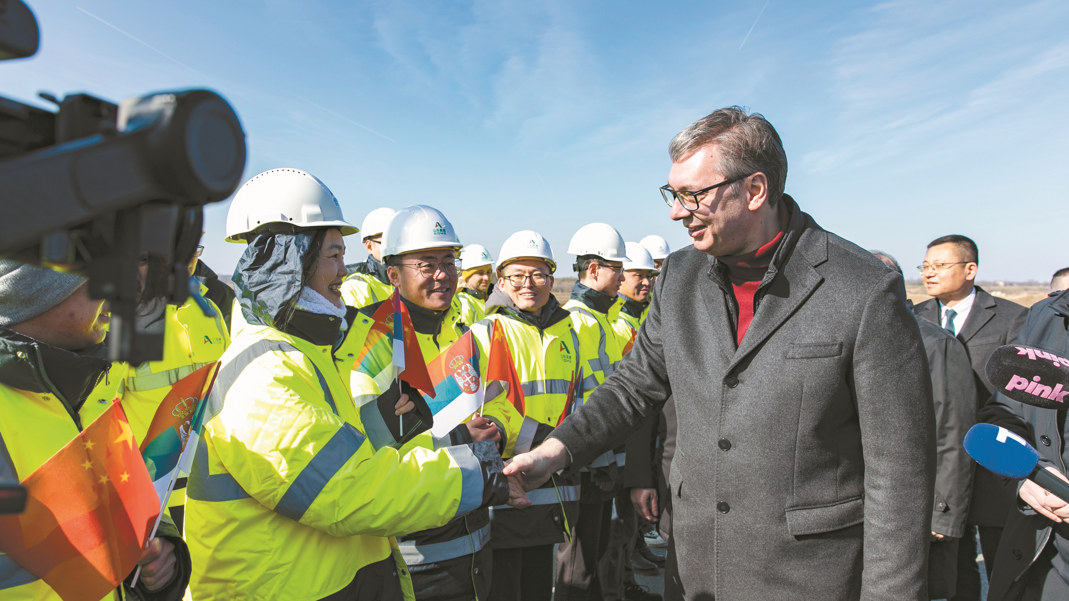 图为2月22日,在塞尔维亚波扎雷瓦茨,塞总统武契奇(前右)与中方建设者握手。(新华社发)