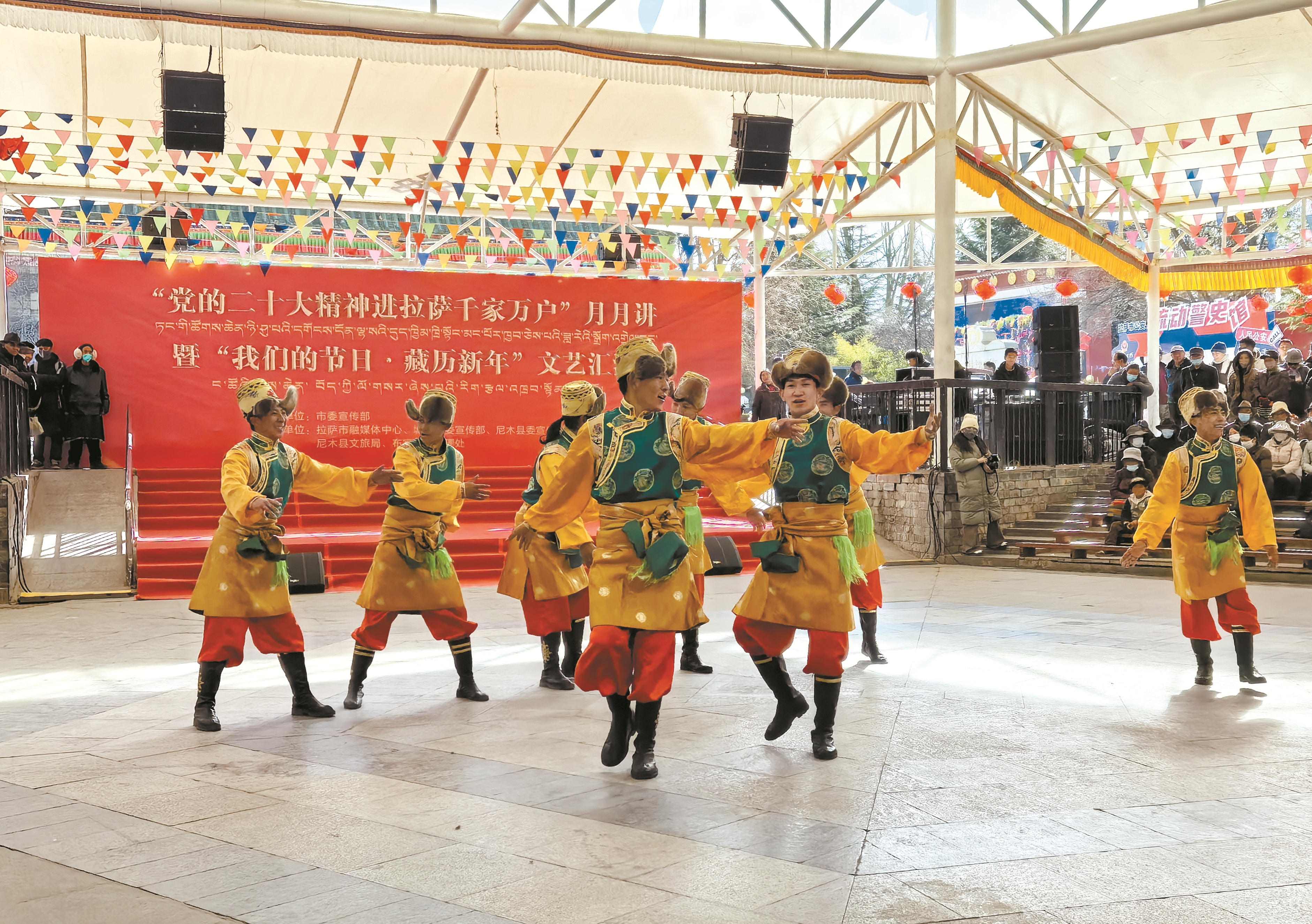 宣讲结束后,精彩纷呈的文艺演出正式拉开帷幕。从热情洋溢的开场舞蹈《扎西德勒》,到充满民族风情的节目《尼木果谐》,独唱、群舞、二重唱等依次登场。演员们用精湛的技艺和饱满的热情,赢得了现场观众的阵阵掌声和欢呼声。大家在欣赏精彩节目的同时,也深切感受到了藏历新年浓浓的节日氛围。