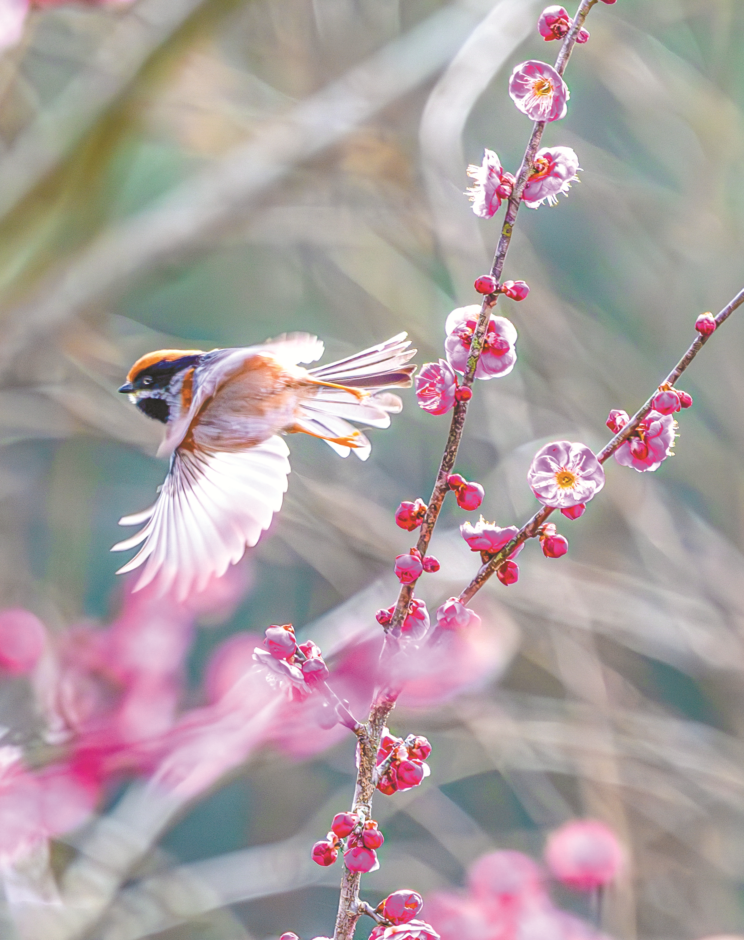 ?这是二月十六日,在重庆市南川区大观镇,小鸟在绽放的梅花间飞舞。 (新华社发)