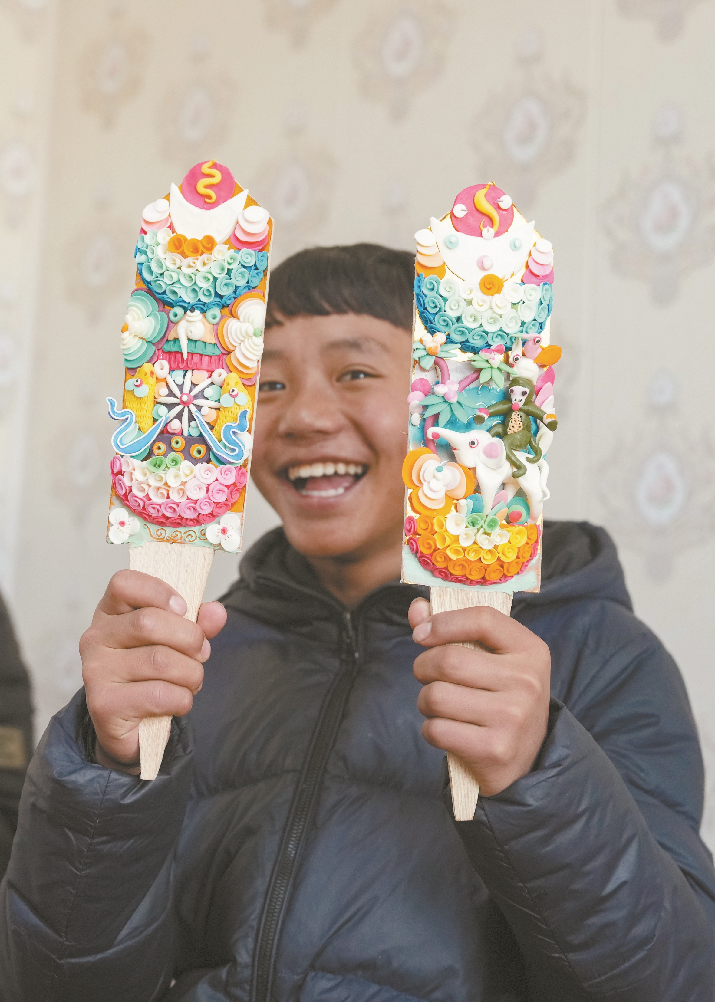 ?这是在拉萨市老城区,小学徒在展示刚刚做好的一对酥油花(2月25日摄)。 新华社记者 晋美多吉摄